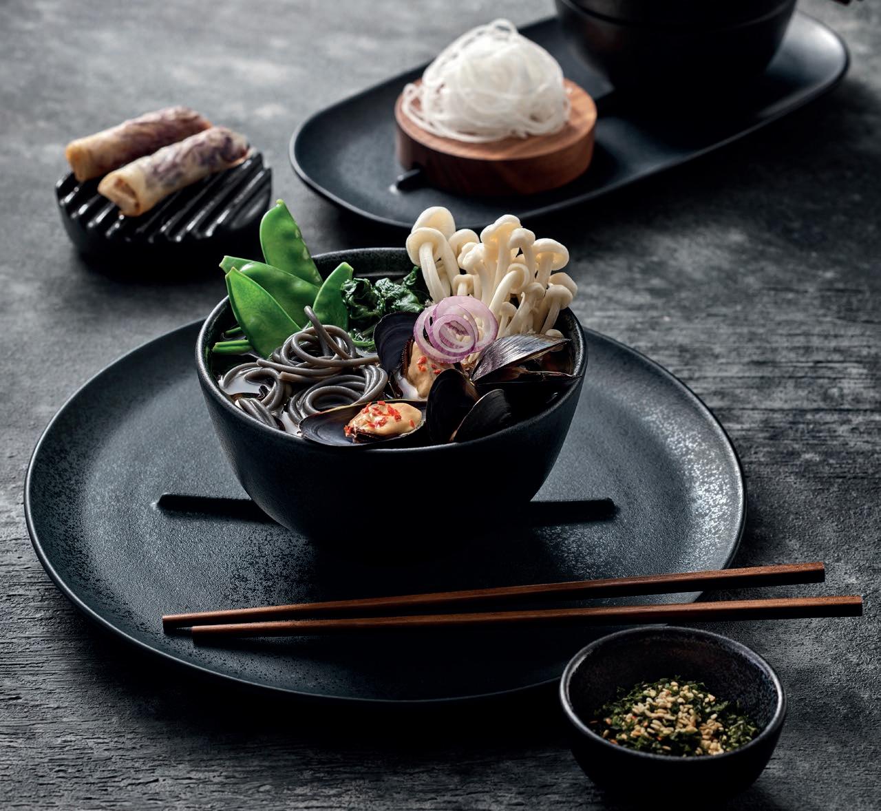 LOW BUDGET. Werden sie attraktiv und hochwertig präsentiert, machen auch Gerichte aus kostengünstigen Zutaten eine gute Figur. RENEW serviert die neue Budget-Sensibilität in einer modernen, nachhaltigen Ästhetik. Das strenge Design der dunklen Artikel aus der Recyclingmasse EcoGres® fasst das Food in einen hochwertigen Rahmen, mit einem Touch von Coolness.