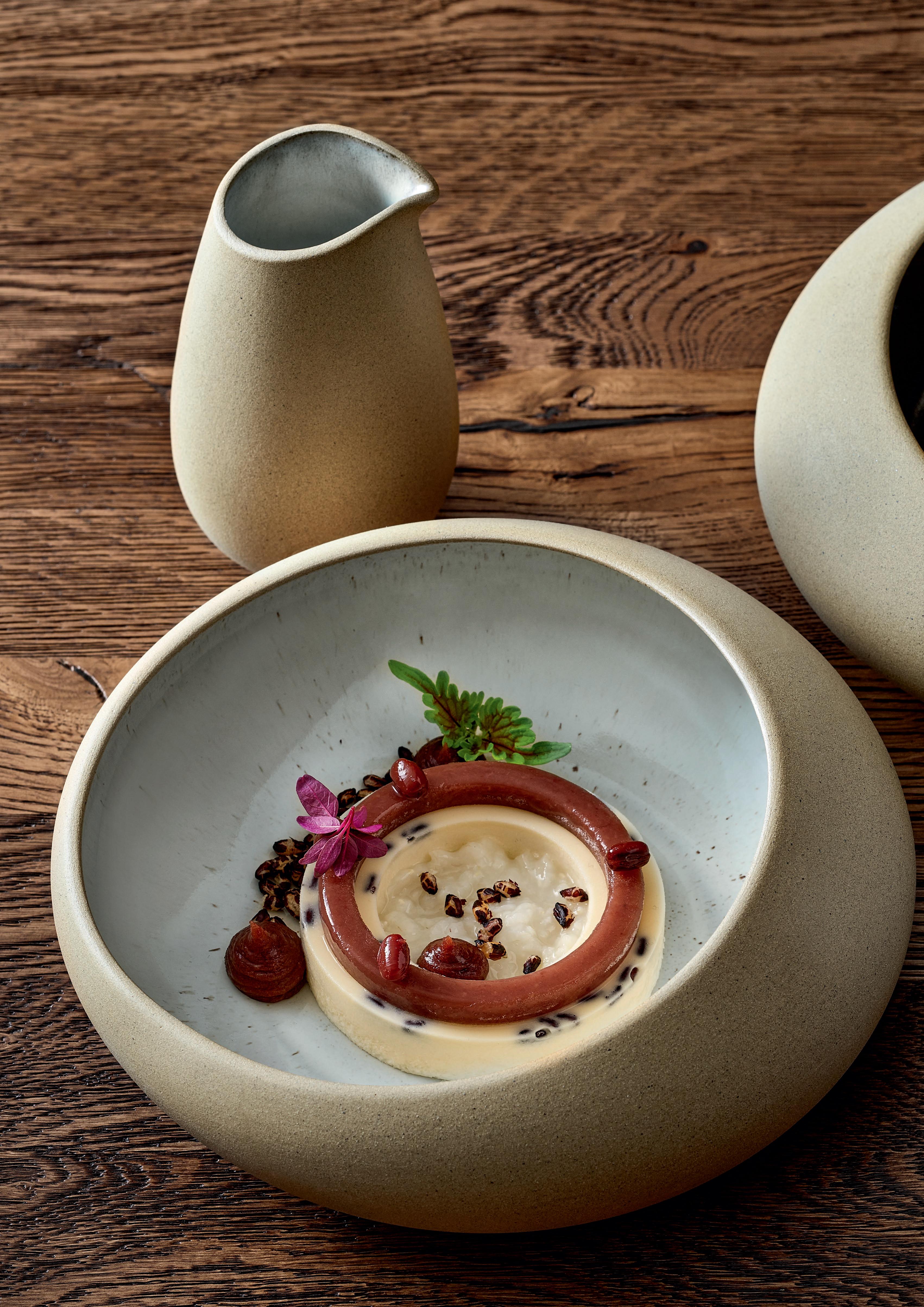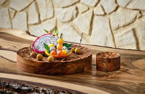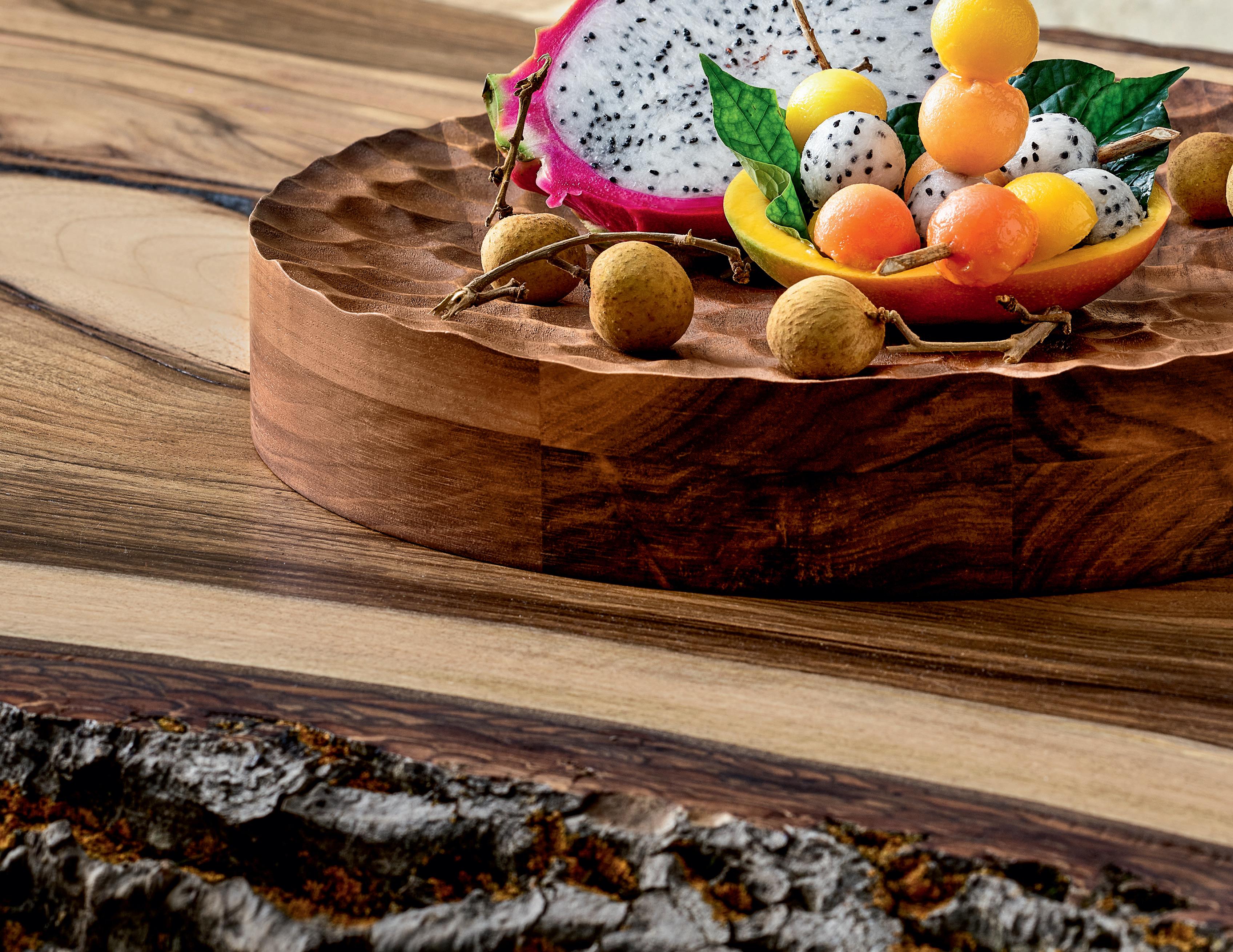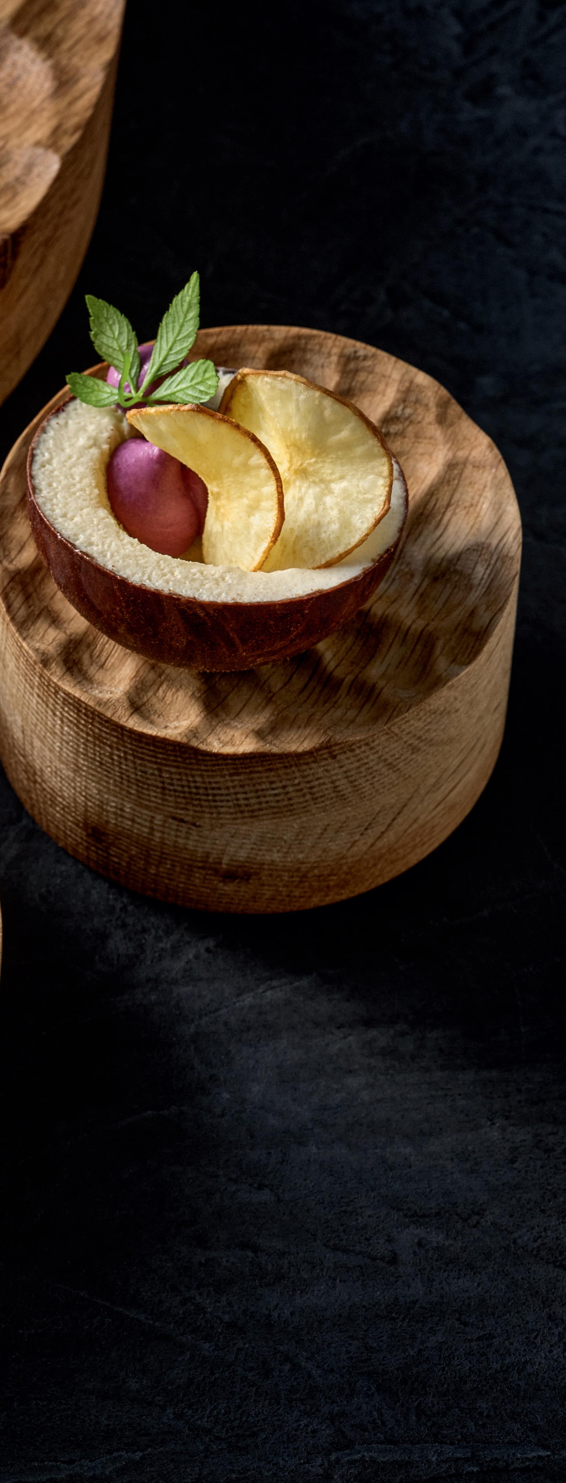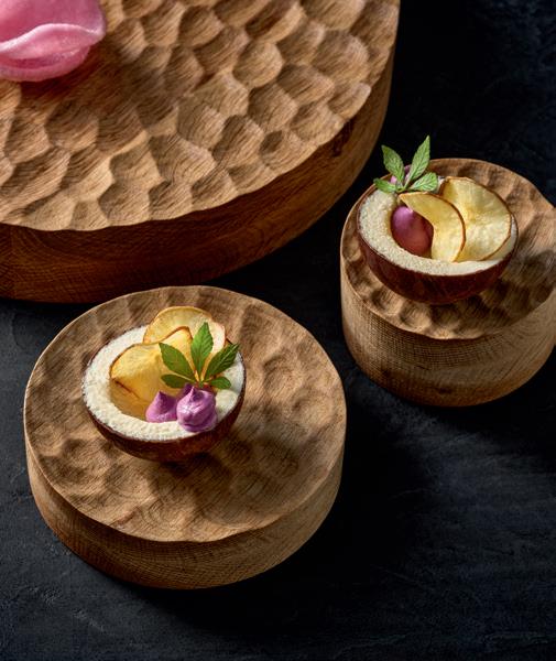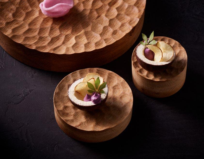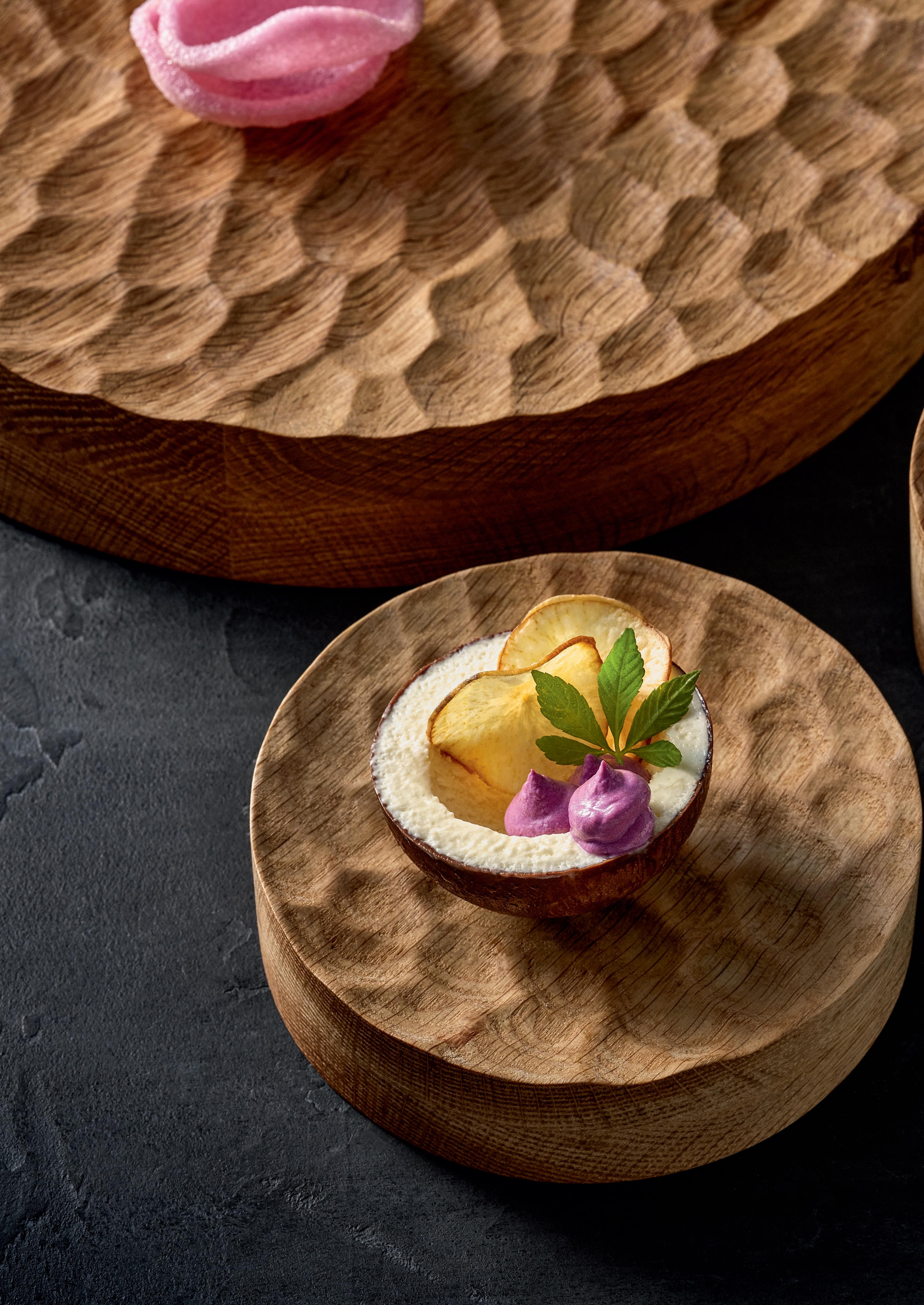 ENGINEERED NATURE. Deep-fried cassava with purple mashed sweet potatoes – served in an edible coconut bowl on the new wooden ELEVATE platform. Fine, regular indentations have been milled into the surface of the round wooden block, reminiscent of a surface of water rippled by wind.