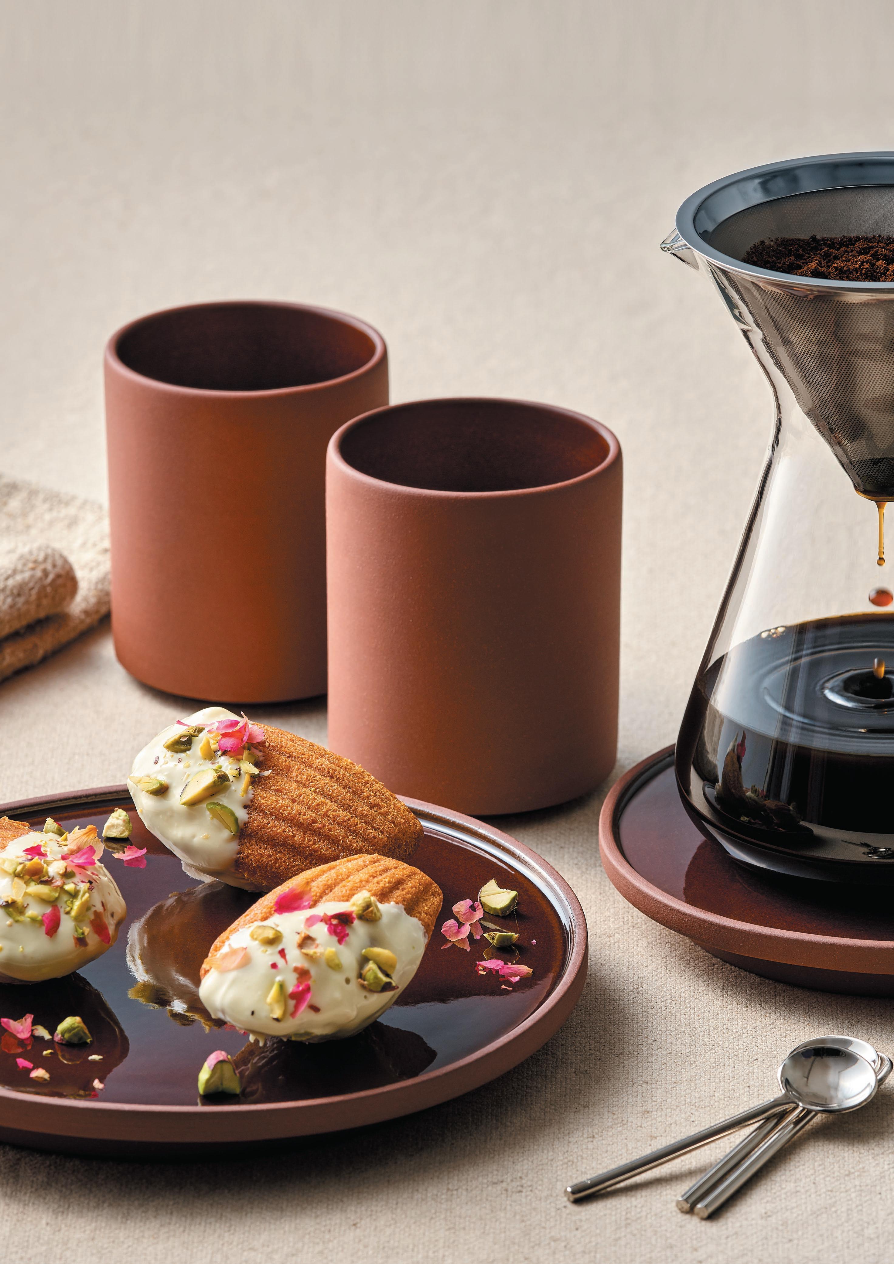 COFFEE TO SHOW. JARDIM, PLAYGROUND’s first terracotta collection, exudes Portuguese summer vibes in four colors. The reddish-brown body makes for a natural, manufactured look. The plates’ glazed tops and bottoms create even more playfulness and variety. Why not? Breakfast feast with Belgian waffles on a serving board made of acacia wood.