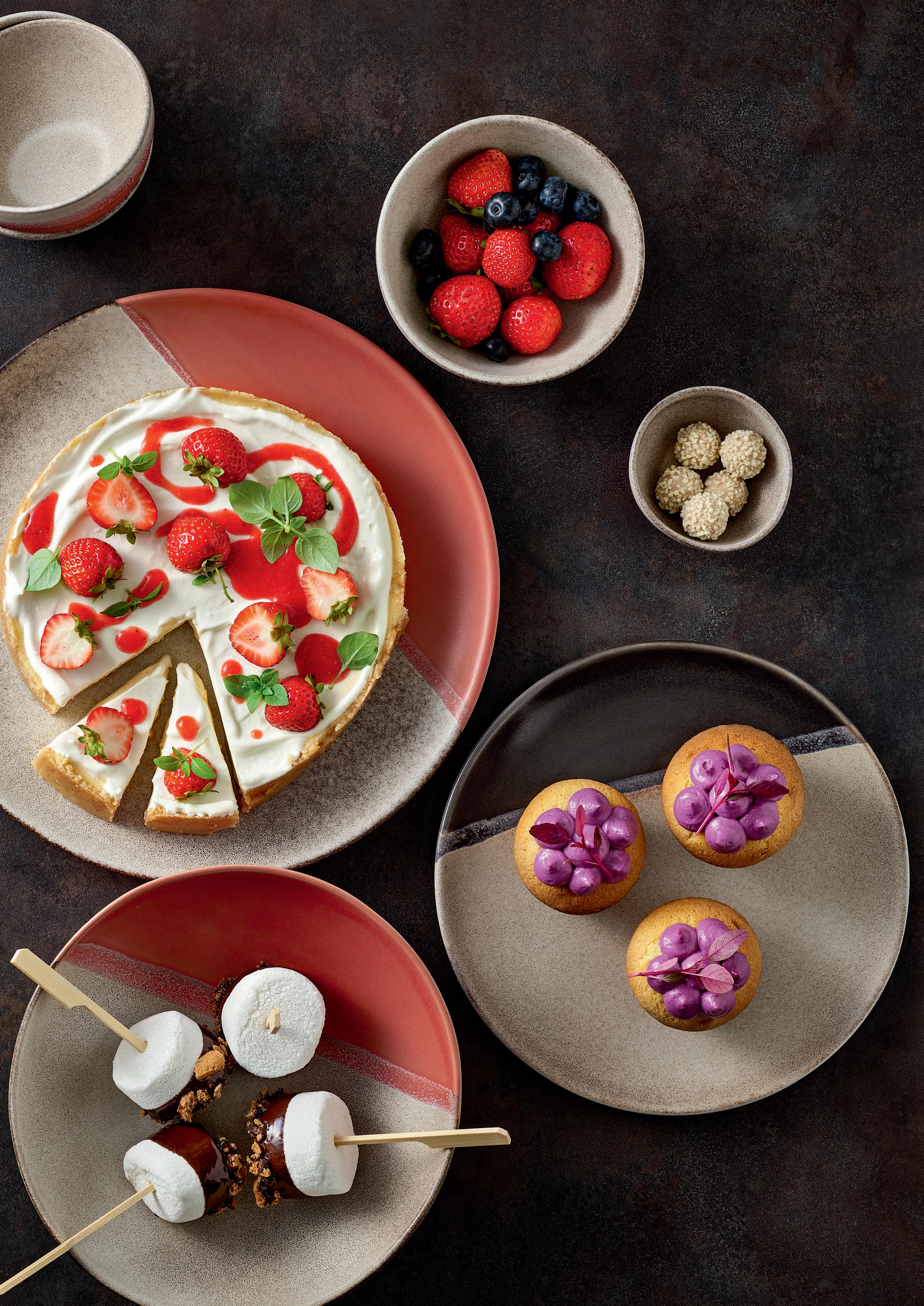 SWEET TOOTHS. Differences arouse curiosity. With its mix of graphic playfulness and organic look, the new SPOT ON stoneware range is a joyful step out of line. The colored segments look as if they have been dipped in chocolate and strawberry sauce.