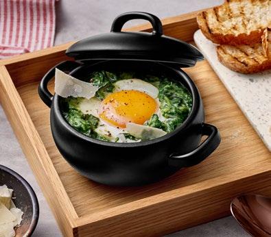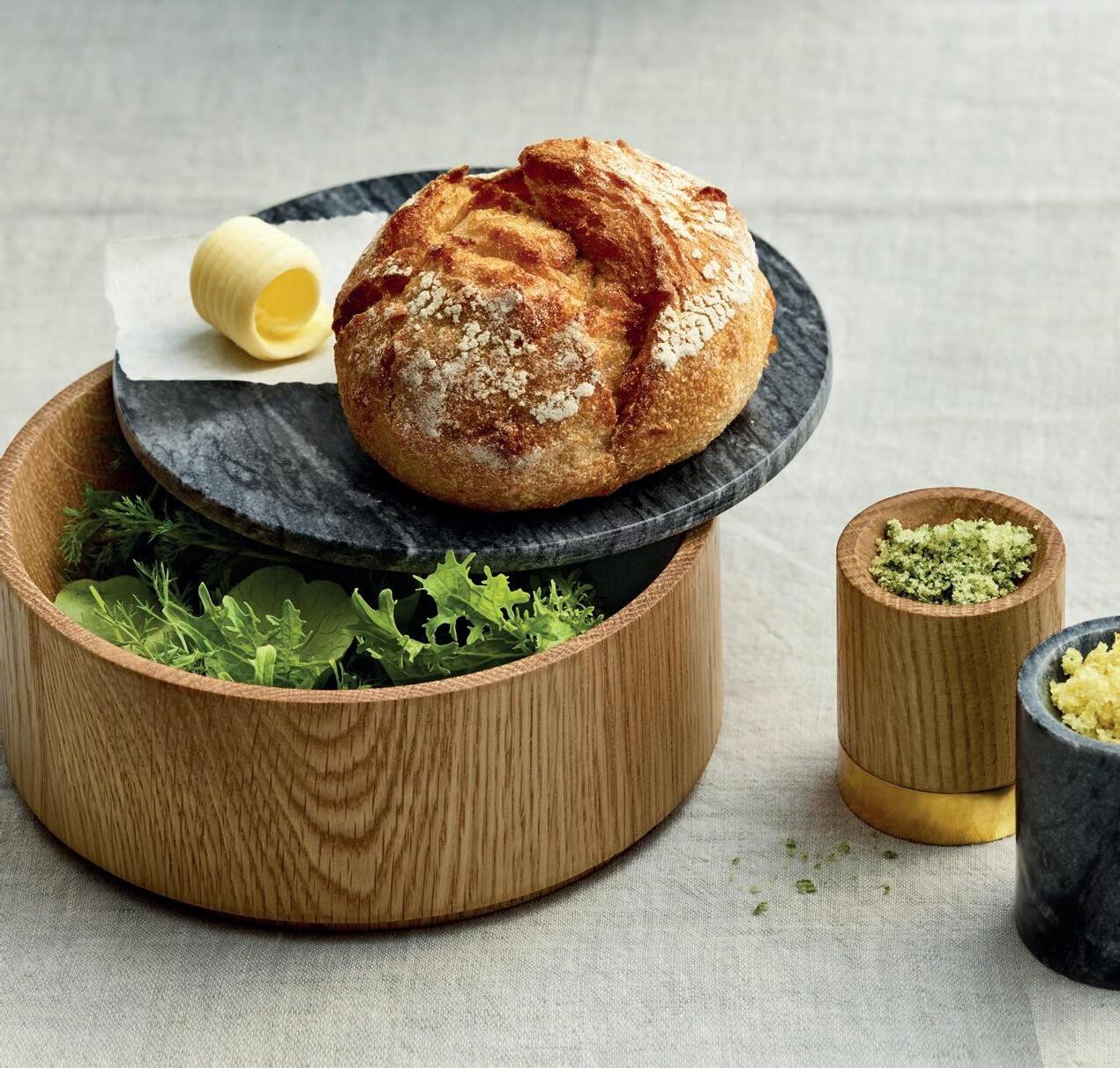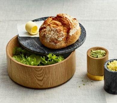 APARTE RAHMEN: Teller aus Akazienholz und kleine Edelstahltöpfe. Die GourmetBowl aus Eiche mit Marmordeckel verleiht auch einfachen Speisen einen Hauch von Luxus. Auf dem Frühstückstisch bilden JARDIM-Bowls gemütliche Nester, z.B. für Eierspeisen.