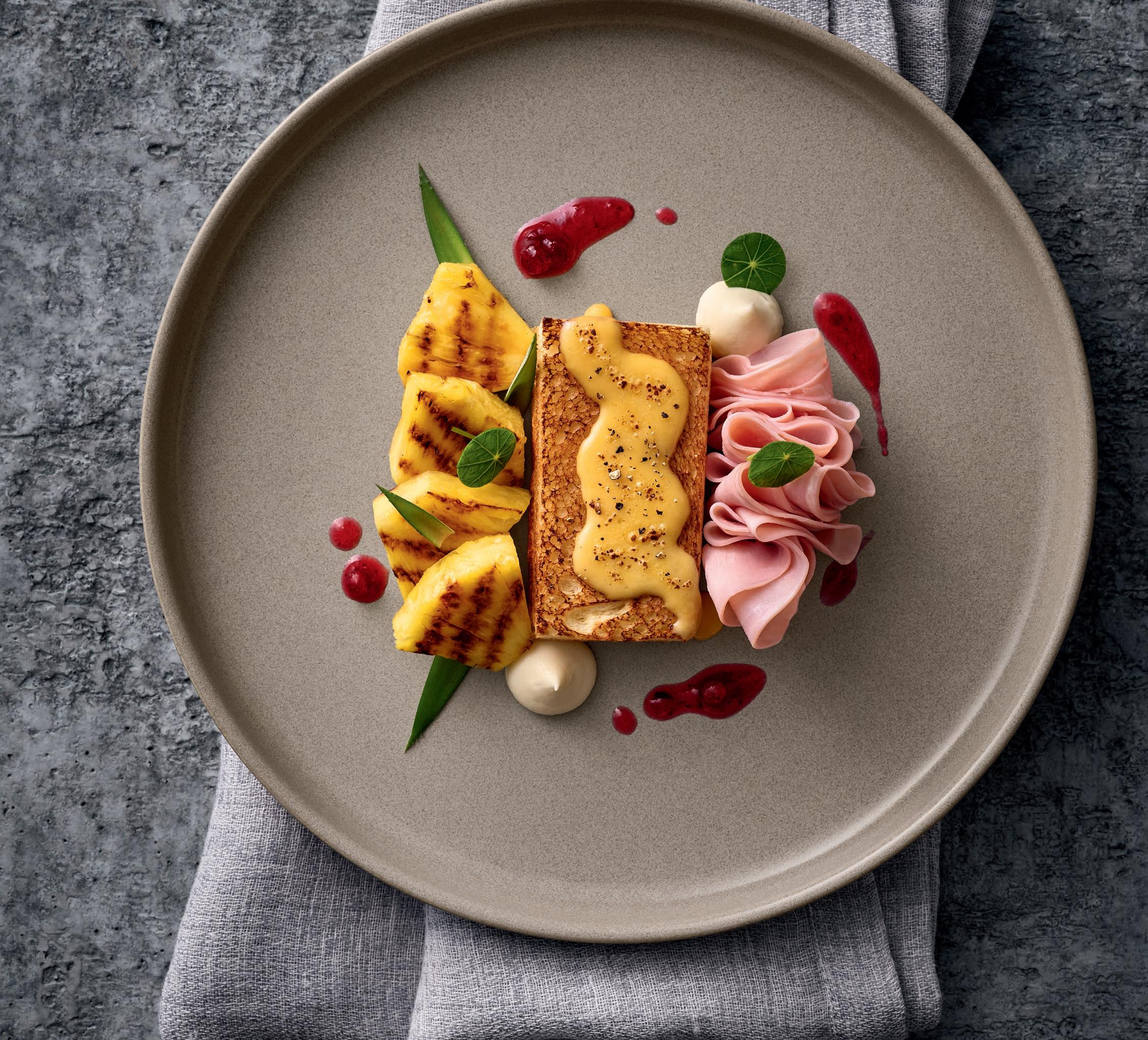 SHAPE IT & DRAPE IT. Toast Hawaii neu interpretiert auf einem sandfarbenen Teller aus der Steinzeug Kollektion ELEMENTS.