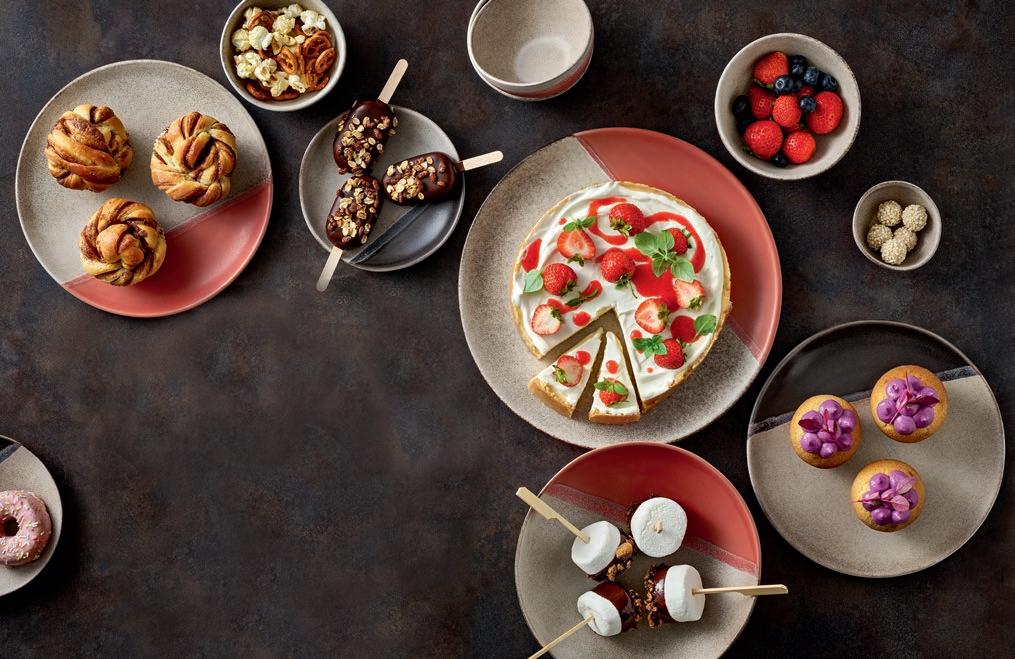HEALTHY FINISH. Den anhaltenden PlantBased-Trend bedienen vegane, zuckerreduzierte Desserts mit Ei-Ersatz, Milchalternativen und veganer Schokolade. Poppig in Szene gesetzt auf Steinzeug-Cocotte mit Weithalsflasche mit Glasstrohhalm.