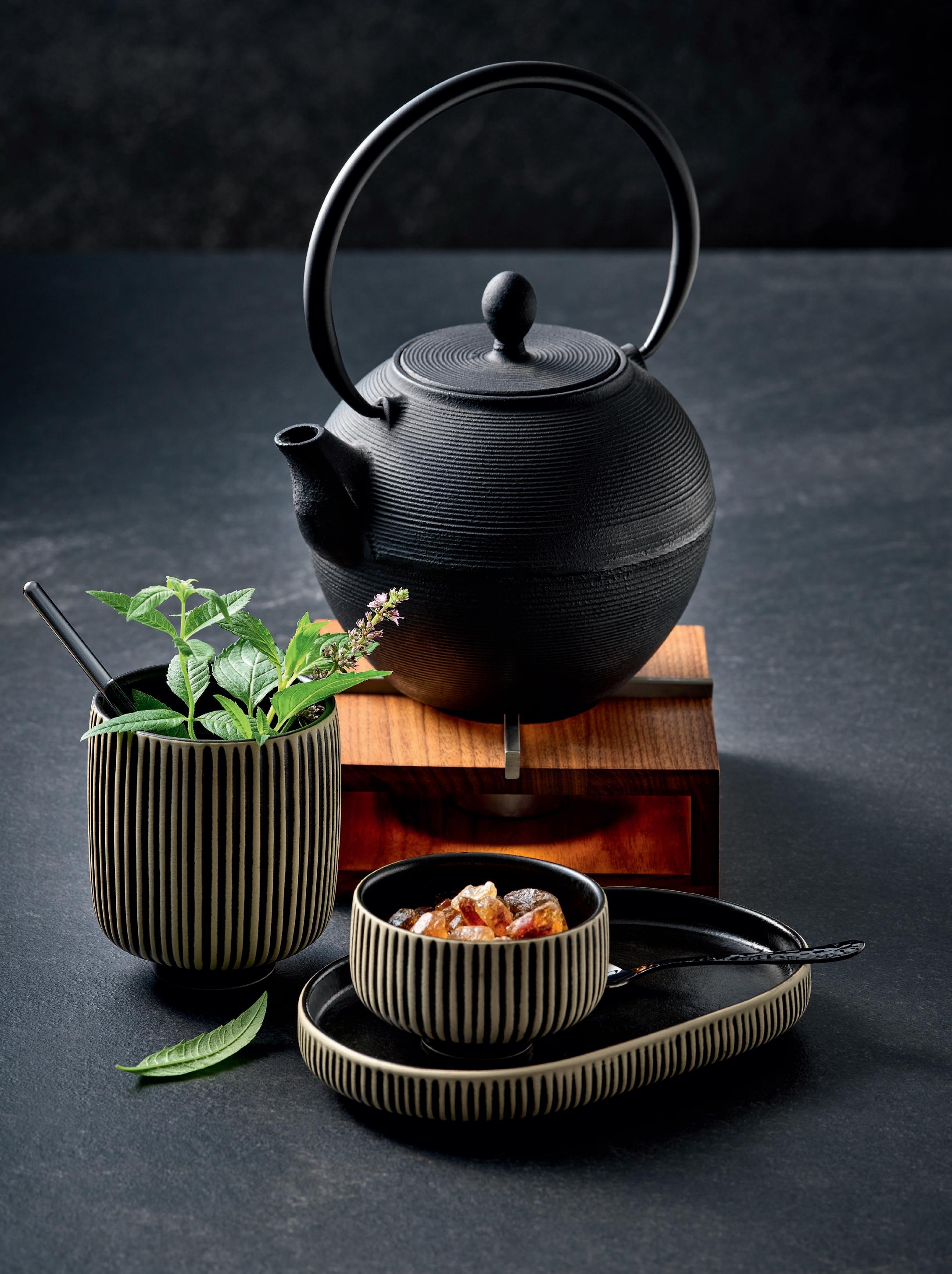 NO-FRILLS. NARA black&white und die gusseiserne Teekanne kommen ganz ohne verspielte Details aus. Das PLAYGROUND Servierbrett präsentiert die Smörrebröds mit wohlig-warmem Holz-Charme. Warm-up für den Tag: Suppe serviert in massiven TERRA Bowls.