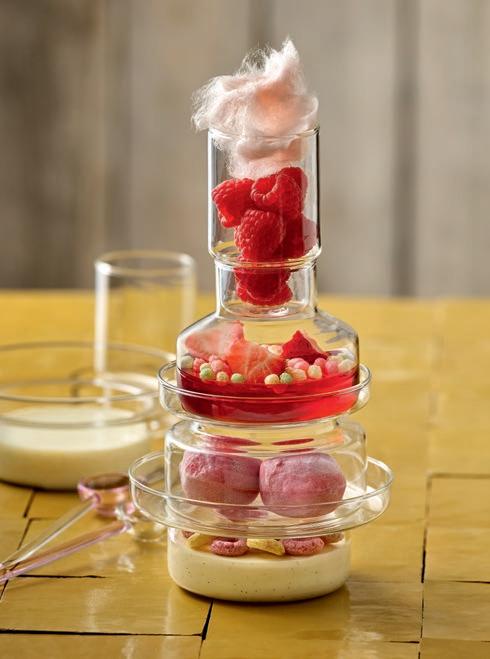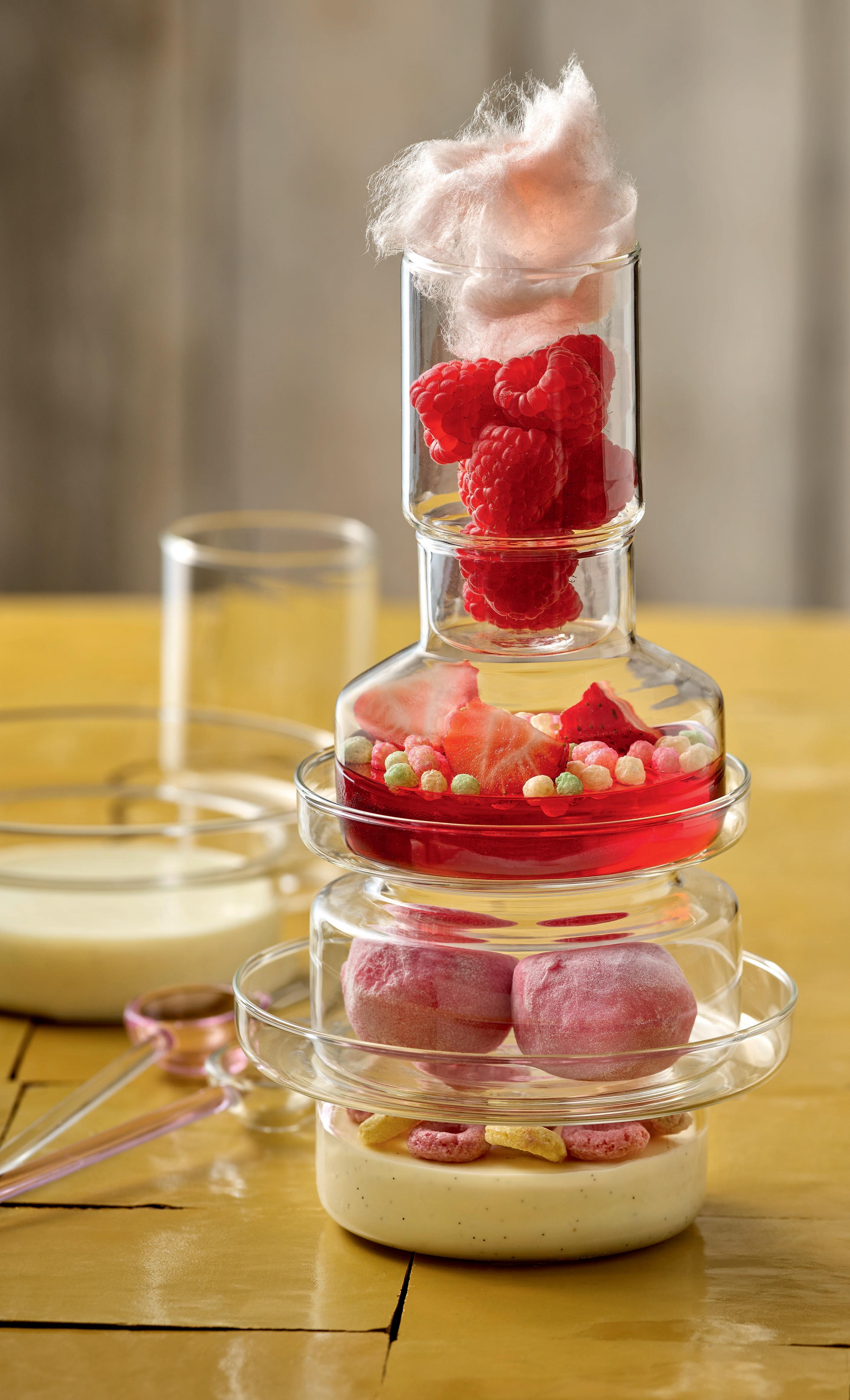 EIN ECHTER HOCHSTAPLER. Der Amuse-Tower aus temperaturbeständigem Borosilikat-Glas präsentiert die Nachspeisen vertikal. Die Glas-Elemente sind gestapelt oder einzeln einsetzbar.