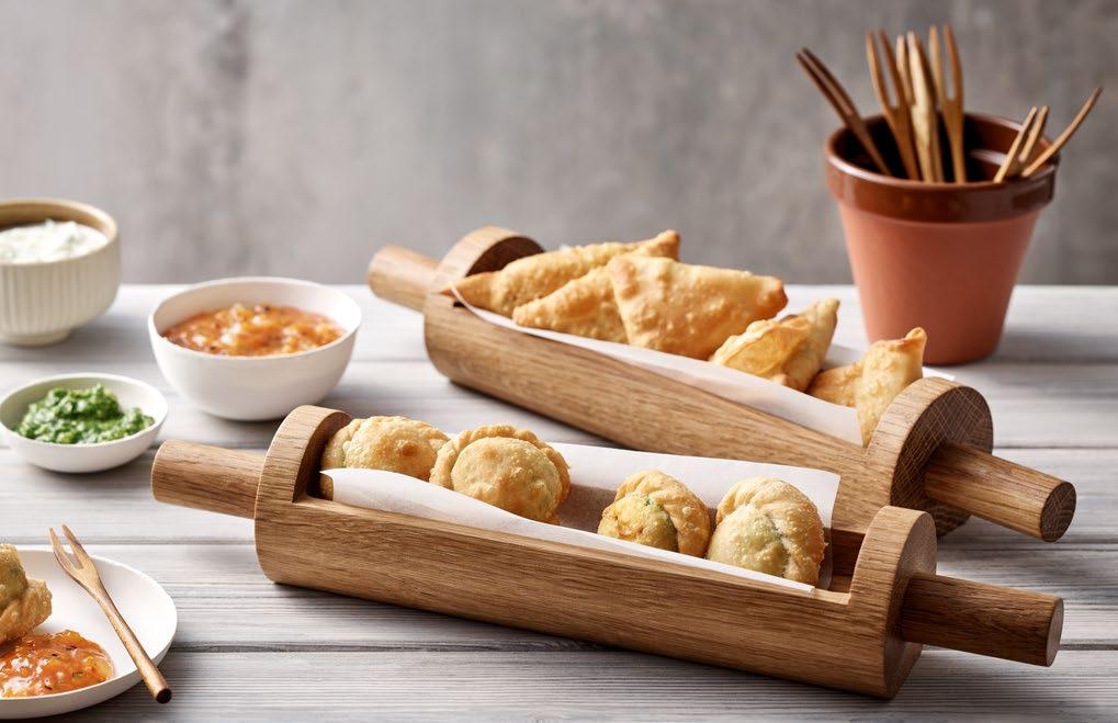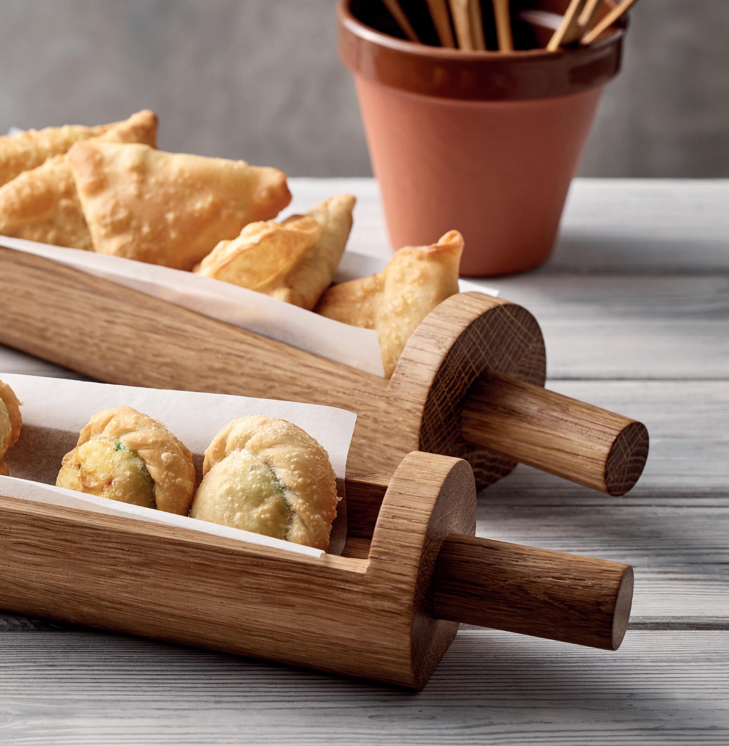 IT’S A MINI! International cuisine fares well in the trend of healthy snacking, e.g. samosas, delicious dumplings from India. Originally presented in an oak rolling pin which has a flat base to keep it sturdy.