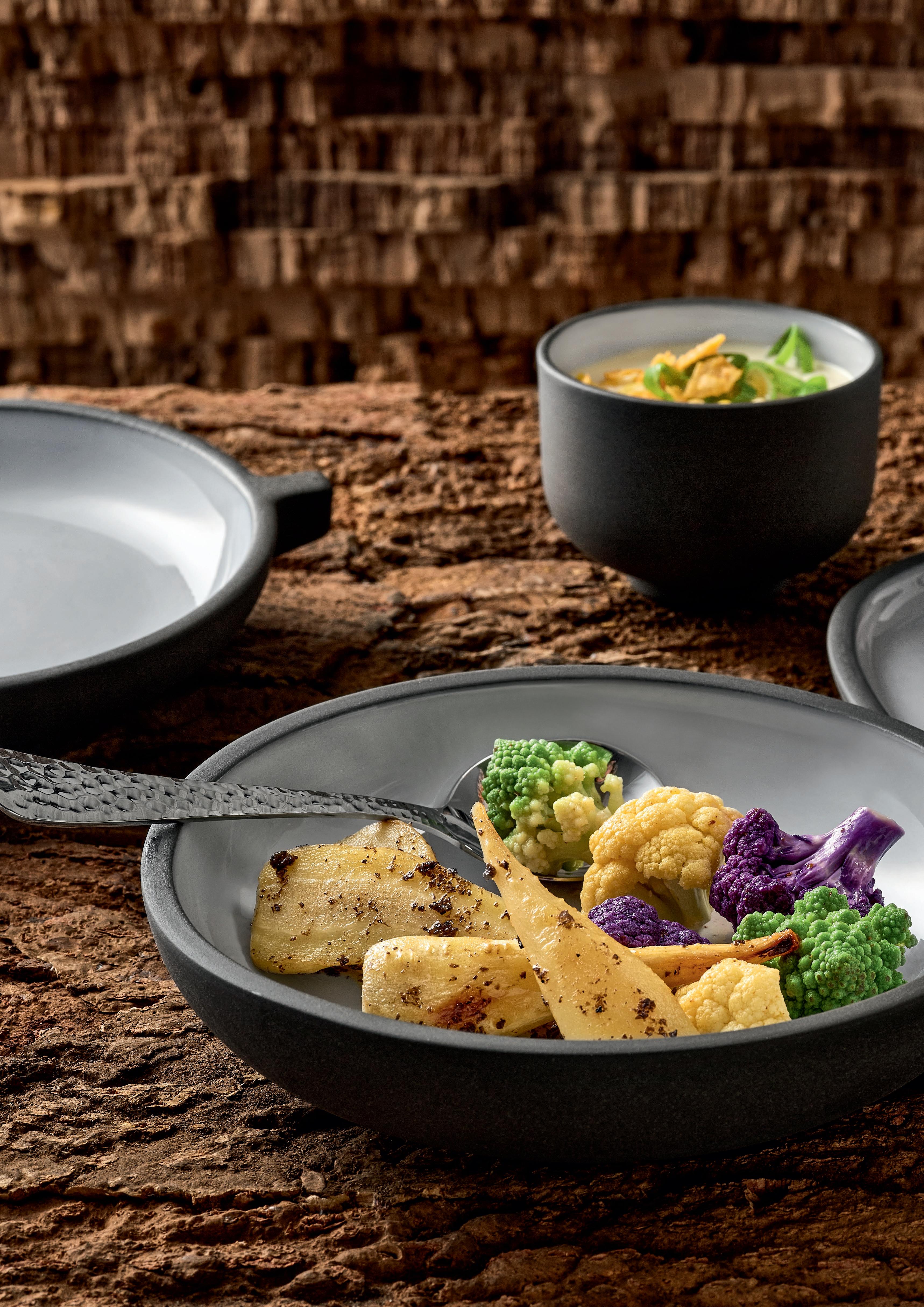 CHEFS’ MUSE. Potato soup with bacon, ELEMENTS lends the aromatic ‘farmer’s truffle’ star appeal. Speaking plainly: Black NARA stoneware plate combined with glossy, stainless steel. The clear design of the stoneware cocotte with a silk-matte glaze creates a harmonious flair without retro kitsch.
