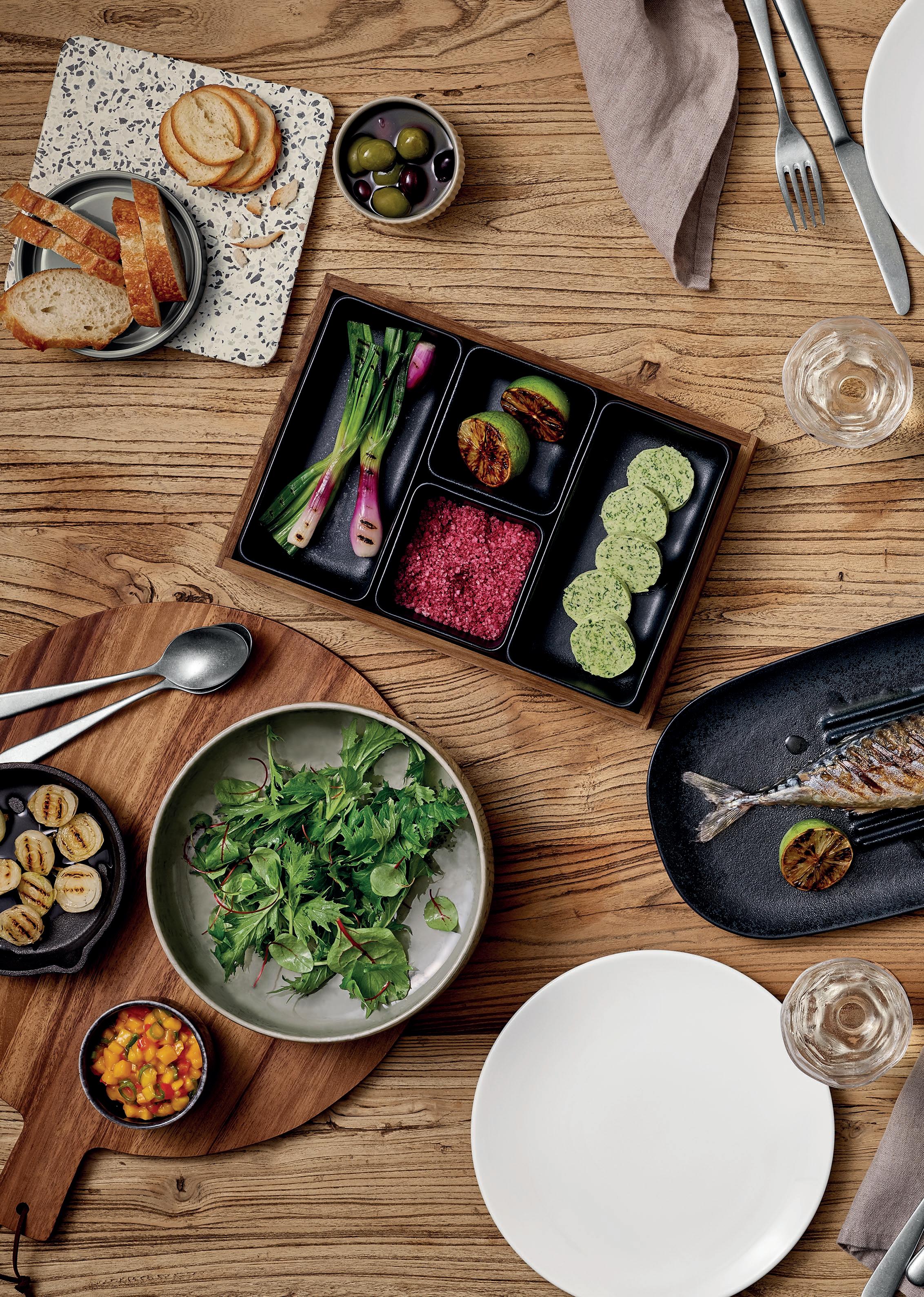 SHARING XXL. Dinieren wie in alten Zeiten: Große Braten oder Fische werden am Tisch aufgeschnitten und verteilt. Gemüse und Beilagen reicht man in Schüsseln. Die großzügigen Platten und Schalen von RENEW bieten genügend Fläche und Raum dafür.