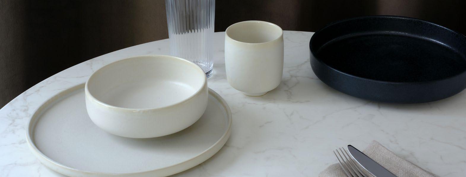 ReNEW wird aus dunklem ECOGRÈS®, einem nachhaltigen Steinzeug, das zu über 90 % aus recycelten Materialien besteht, hergestellt. Die Kollektion verbindet schlichte Eleganz mit einer wunderbar natürlichen Anmutung. Zurückhaltend im Design, mit matter, unglasierter Außenseite, entfaltet sie eine warme, erdige Ausstrahlung. Erhältlich in Weiß und Taupe, umfasst das Sortiment Teller, Platten und Bowls. Unser besonderer Tipp für moderne Coffeeshop-Konzepte: die ReNEWTassen ohne Henkel.