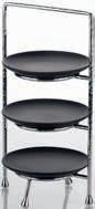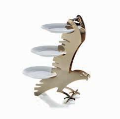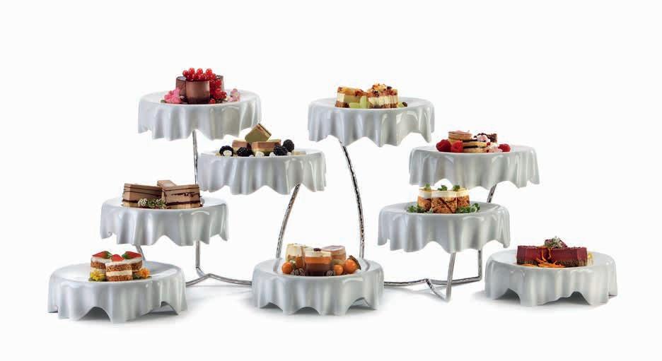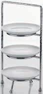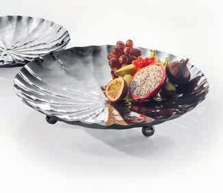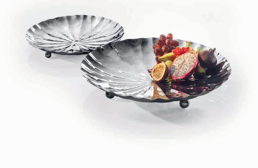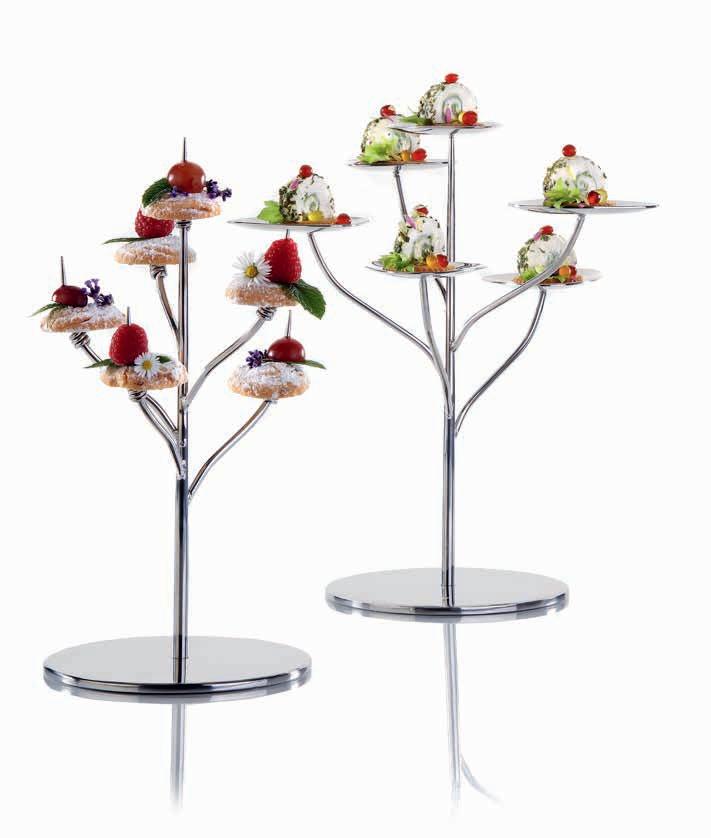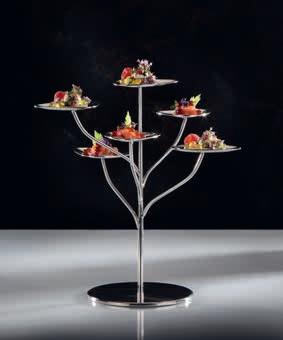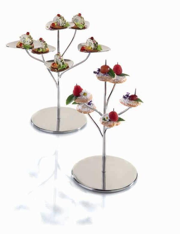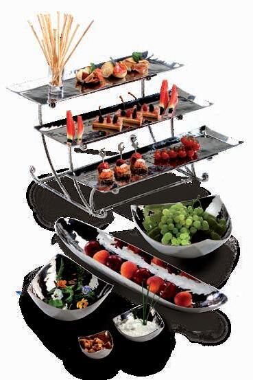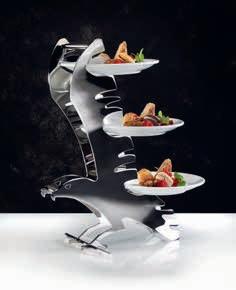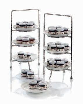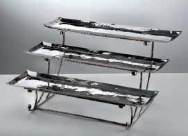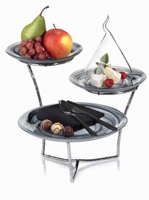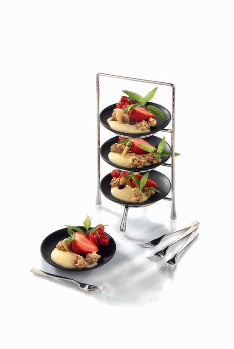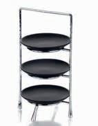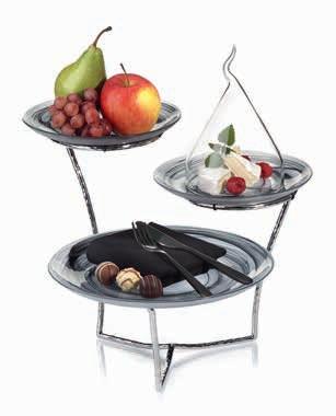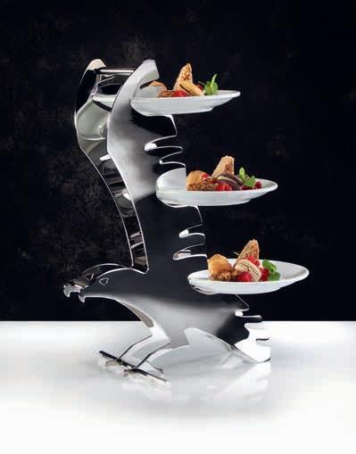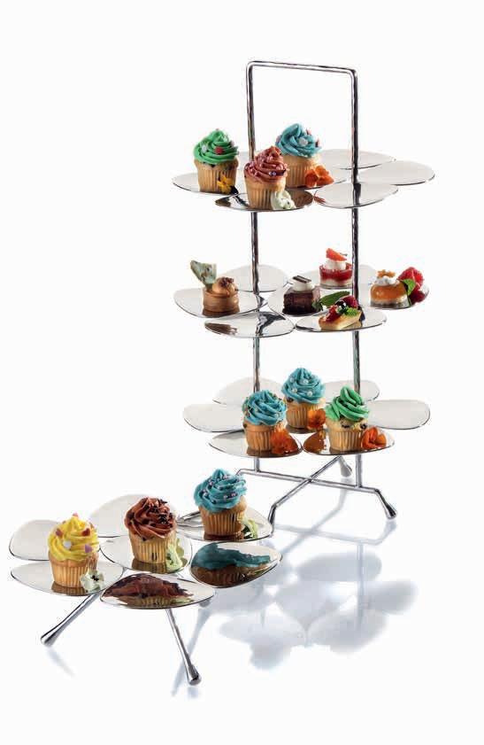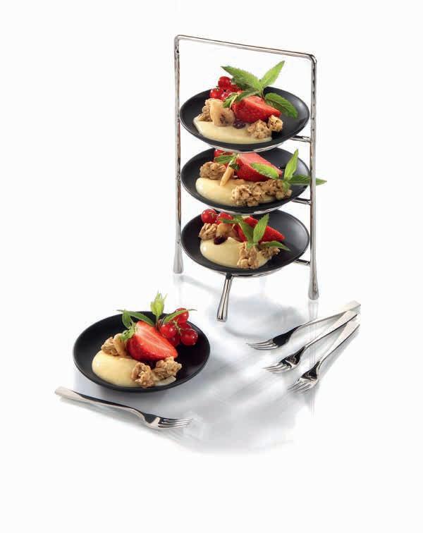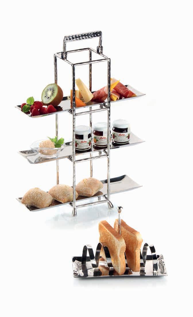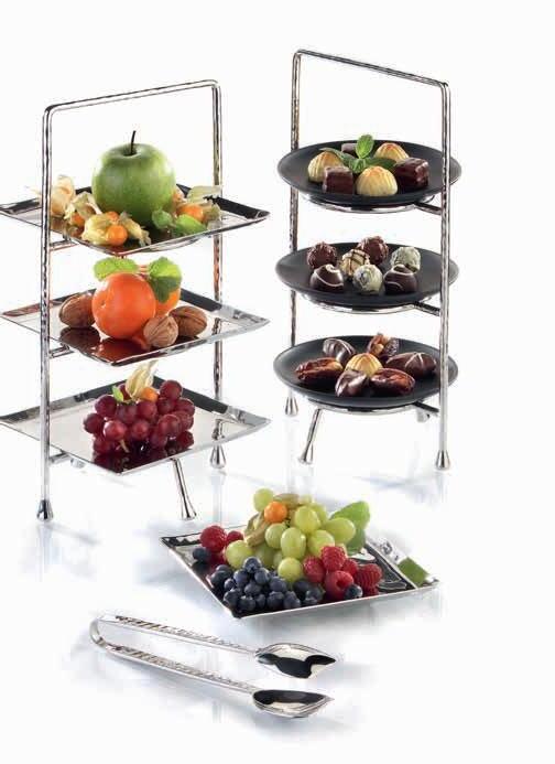 Die dreistufige Etagere aus gehämmertem, auf Hochglanz poliertem Edelstahl ist eine extravagante Basis für Teller und Platten aller Art. Auch auf dem Hotelzimmer lassen sich diese Etageren effektvoll platzieren. Mit „DressCoat“ oder anderem Geschirr bestückt, lassen sich schnell und einfach kleine Snacks, eine Auswahl an Obst oder auch ein süßer Willkommensgruß ansprechend inszenieren. Alle Informationen zu dieser Etagere finden Sie auf Seite 124.