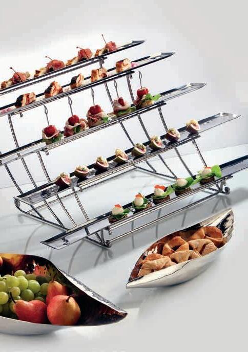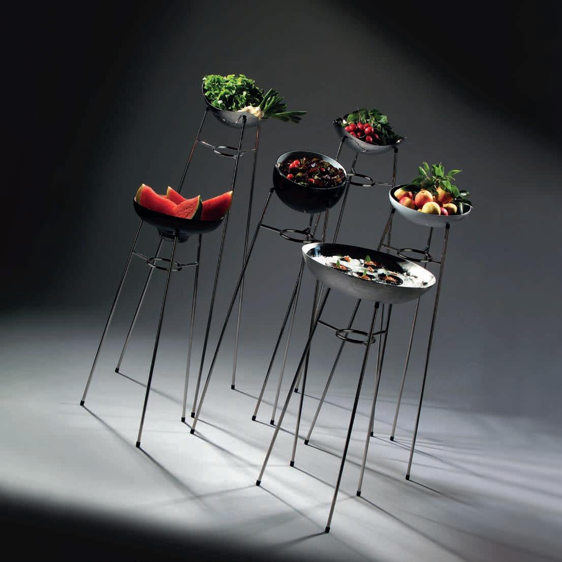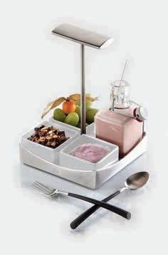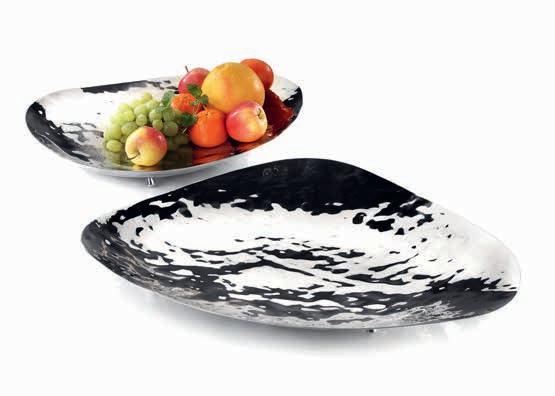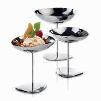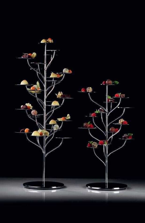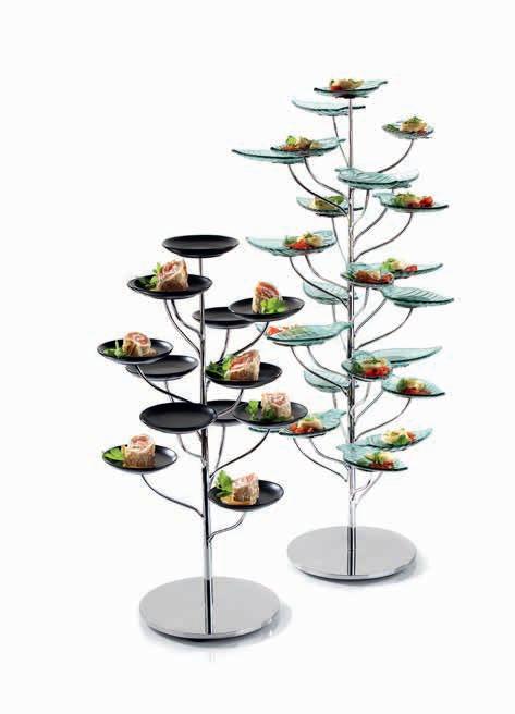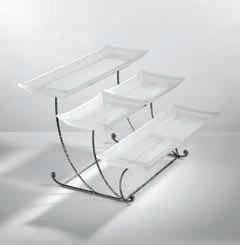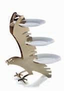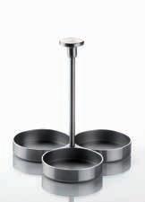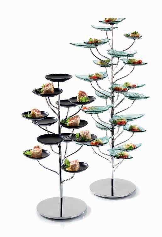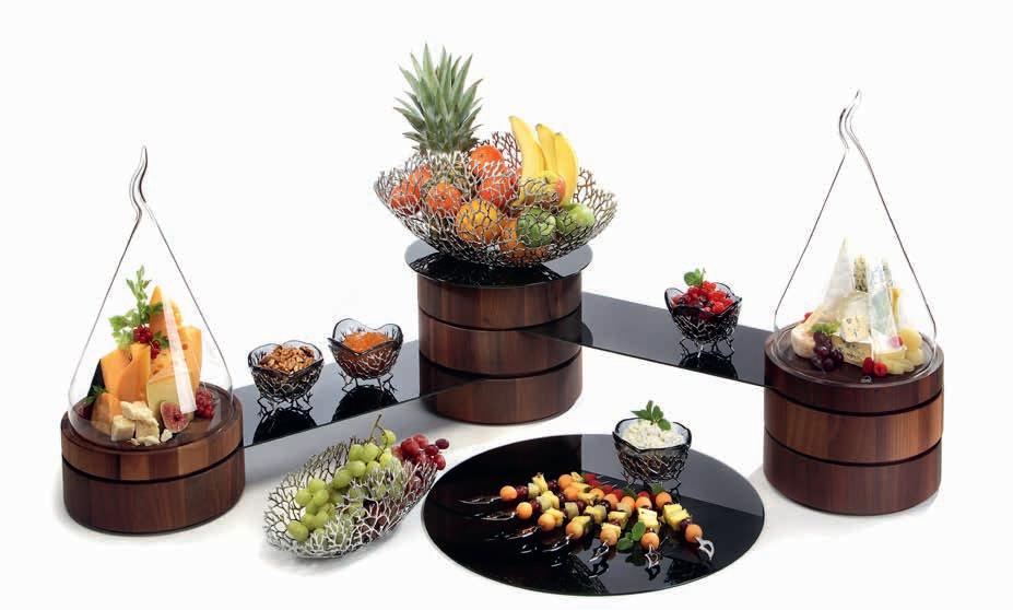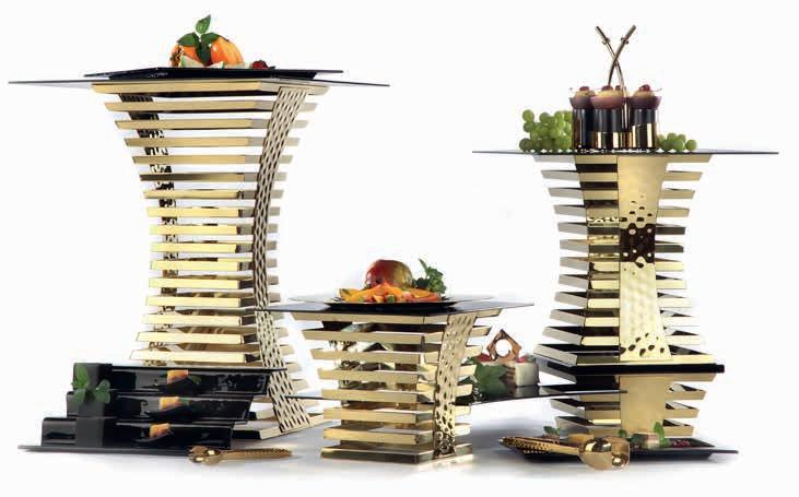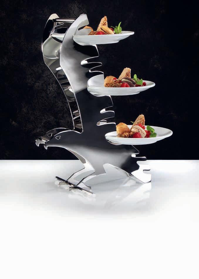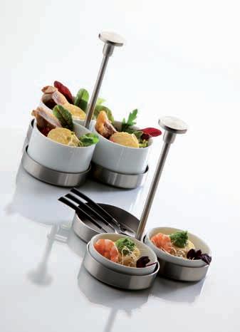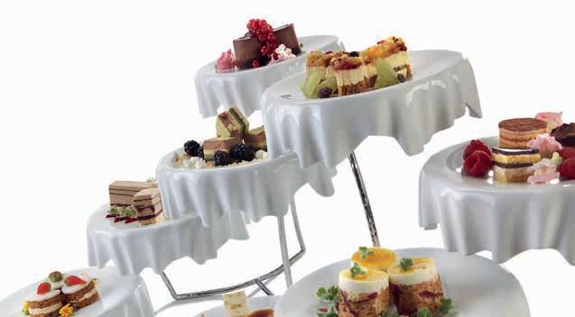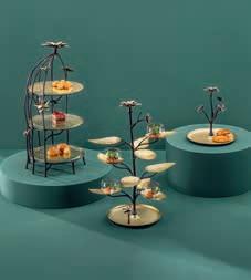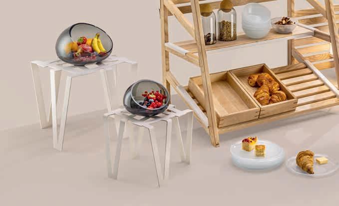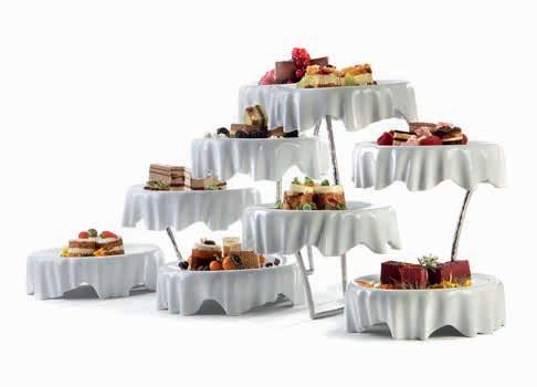 Die dreistufige Etagere aus gehämmertem, auf Hochglanz poliertem Edelstahl ist eine extravagante Basis für Teller und Platten aller Art. Auch auf dem Hotelzimmer lassen sich diese Etageren effektvoll platzieren. Mit „DressCoat“ oder anderem Geschirr bestückt, lassen sich schnell und einfach kleine Snacks, eine Auswahl an Obst oder auch ein süßer Willkommensgruß ansprechend inszenieren. Alle Informationen zu dieser Etagere finden Sie auf Seite 124.