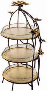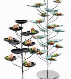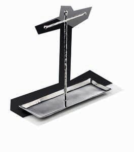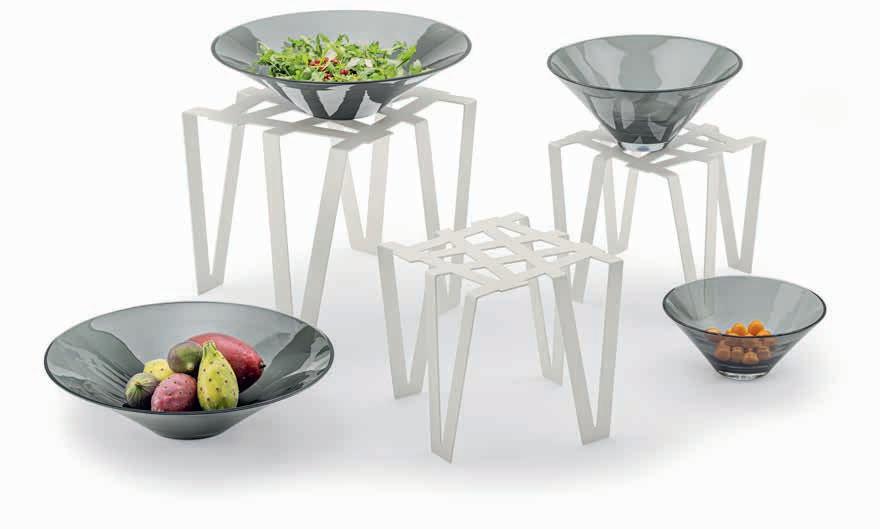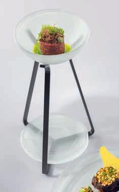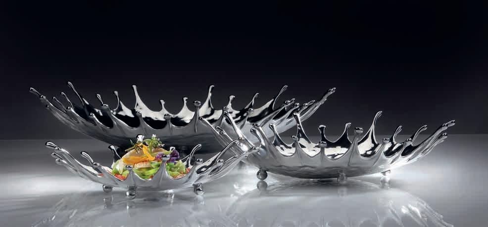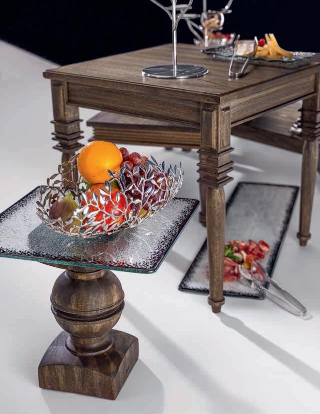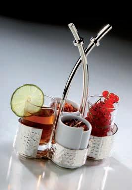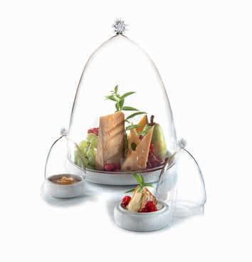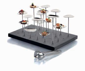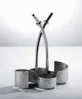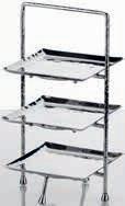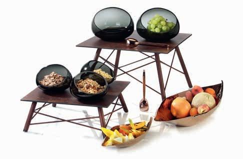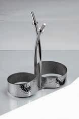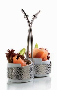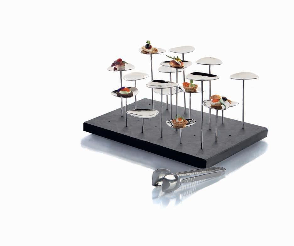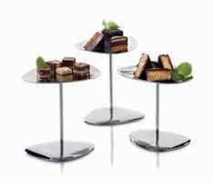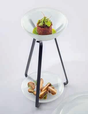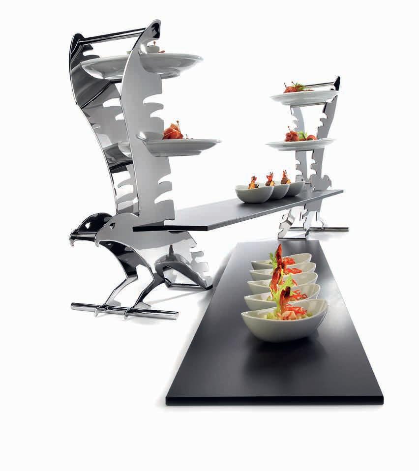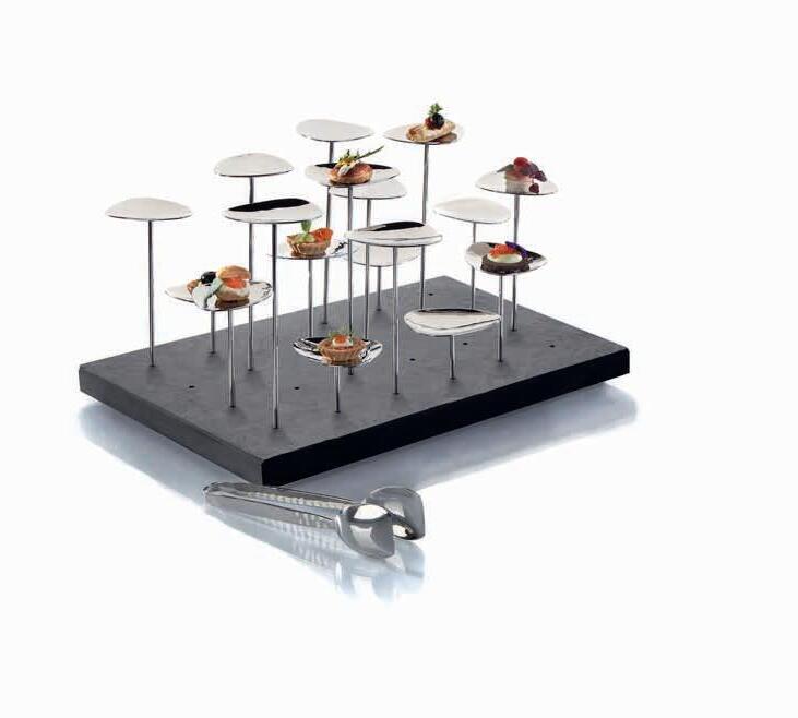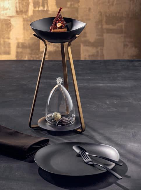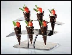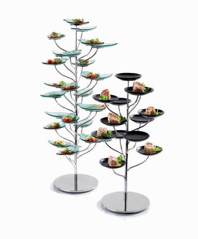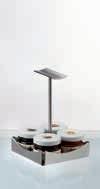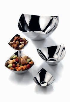 Die dreistufige Etagere aus gehämmertem, auf Hochglanz poliertem Edelstahl ist eine extravagante Basis für Teller und Platten aller Art. Auch auf dem Hotelzimmer lassen sich diese Etageren effektvoll platzieren. Mit „DressCoat“ oder anderem Geschirr bestückt, lassen sich schnell und einfach kleine Snacks, eine Auswahl an Obst oder auch ein süßer Willkommensgruß ansprechend inszenieren. Alle Informationen zu dieser Etagere finden Sie auf Seite 124.