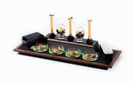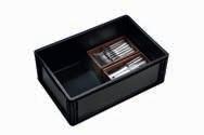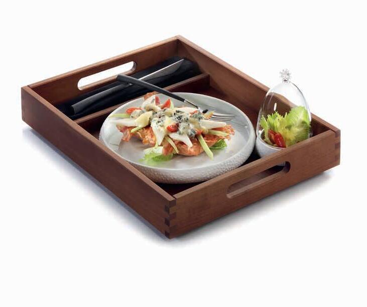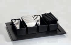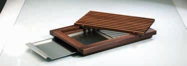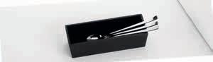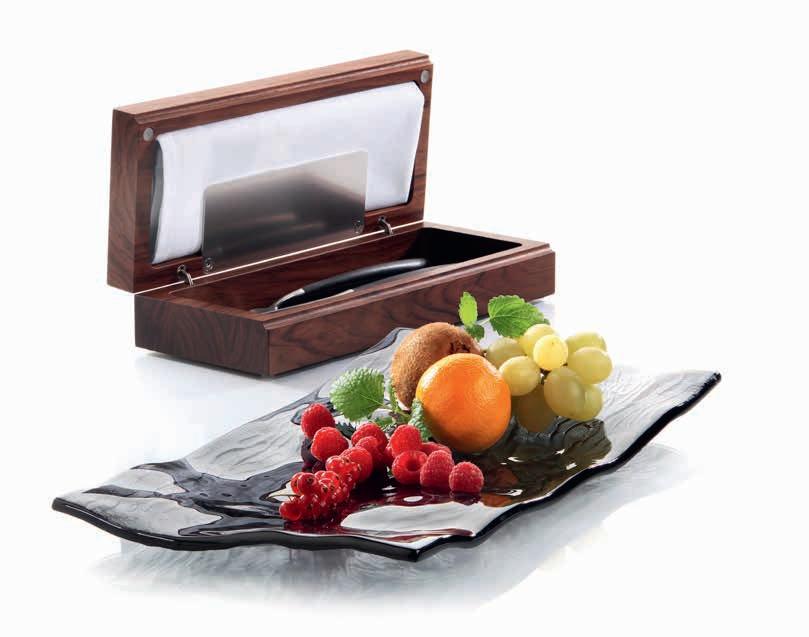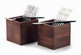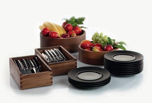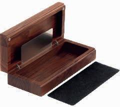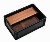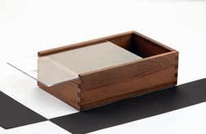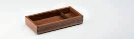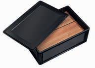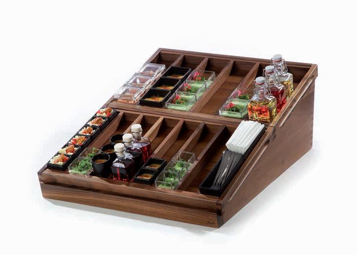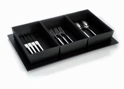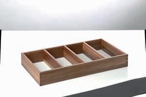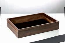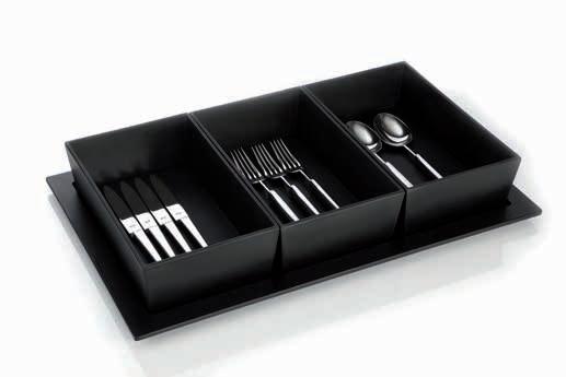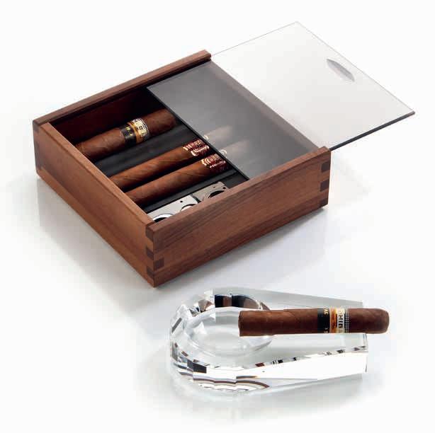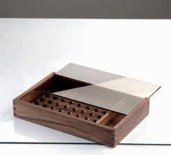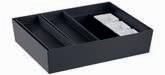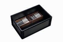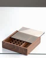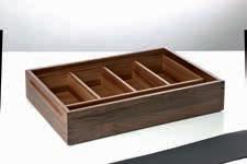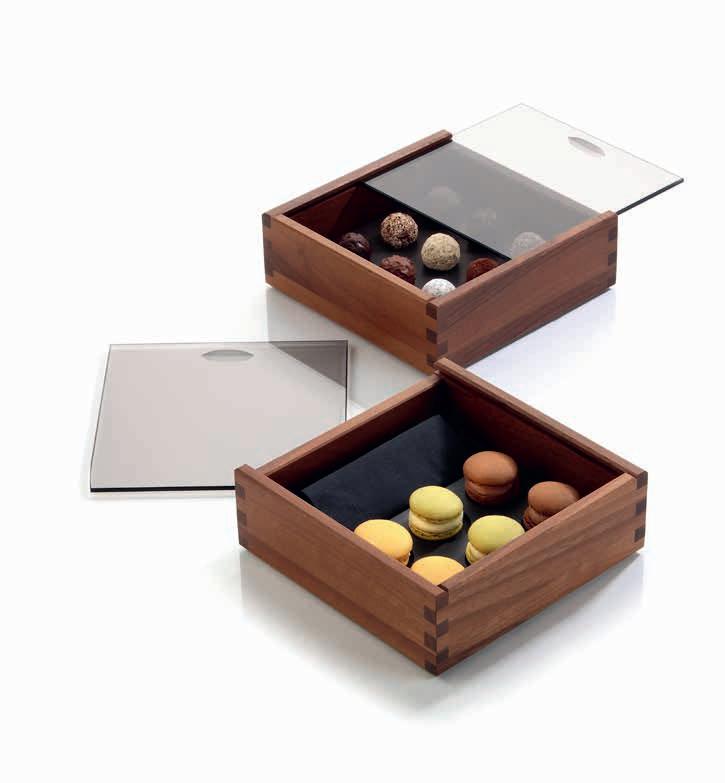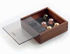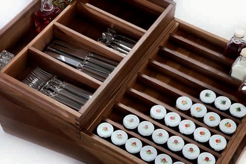 Neben dem Pralineneinsatz für neun Trüffelpralinen und einem flachen Teller für Schnittpralinen, diverse Kleinigkeiten oder Amuse Bouches, sind auch Einsätze für handelsübliche Kaffeekapseln verfügbar. Der Zigarreneinsatz fasst bis zu vier Zigarren, ein seitliches Fach bietet Raum für Zündhölzer, Abschneider, etc.
