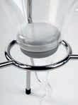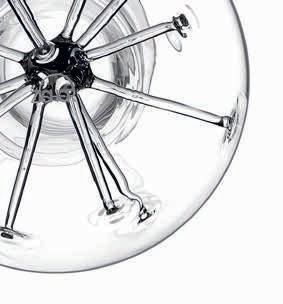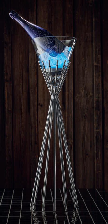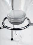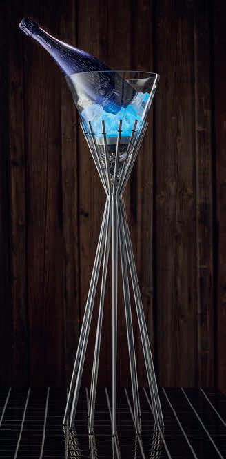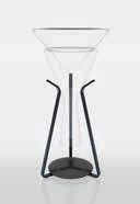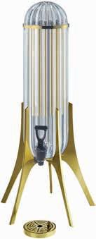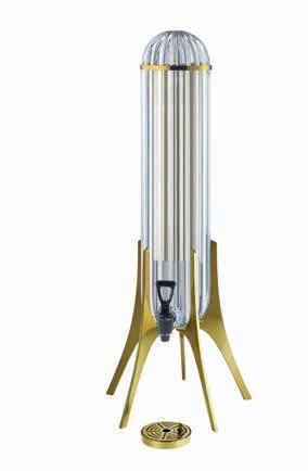 Seine beeindruckenden Maße unterstreichen die repräsentative Wirkung: Bei 4,5 Litern Fassungsvermögen erreicht der Dispenser eine Höhe von 69 cm, die 5,7-Liter-Ausführung sogar imposante 81 cm. Der schlanke Glaszylinder ruht dabei auf einer stabilen, standsicheren Basis aus massivem, sechs Millimeter starkem Edelstahl, die zusätzlich mattschwarz beschichtet ist und die außergewöhnliche Präsenz des Spenders betont. Die Dimensionen des Gestells wurden so bemessen, dass auch hohe Longdrinkgläser genutzt werden können. Bei der noch exklusiveren goldfarbenen Variante sind alle Elemente aus Edelstahl hochglanzpoliert und im PVD-Verfahren veredelt.