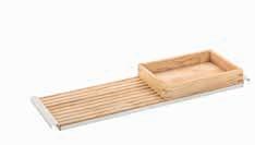 Das Leistenboard bietet die Möglichkeit, Stahlablagen in zwei Größen beliebig zu platzieren, wodurch zusätzliche Flächen entstehen. Diese Ablagen können auch an den Seitenteilen eingehängt werden. Die kleinere eignet sich für Miniaturen, Gläser mit Konfitüre oder Cerealienspender, während die größere Ablage zusätzlich mit einer Box oder einem passenden Glastablett bestückt werden kann.
