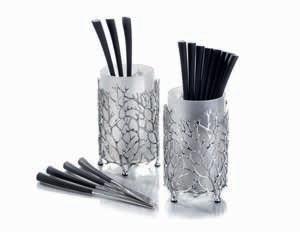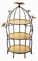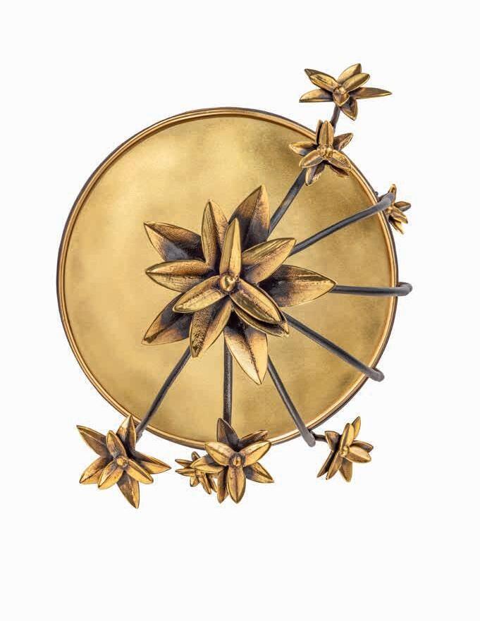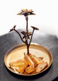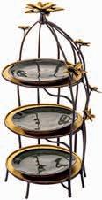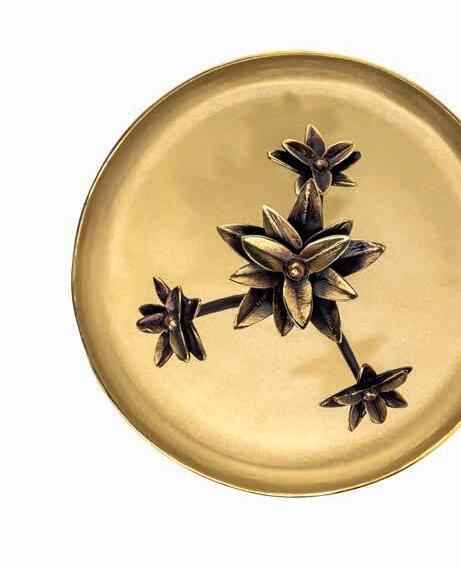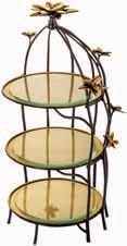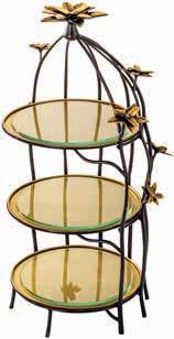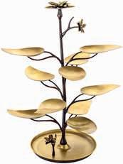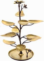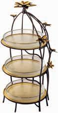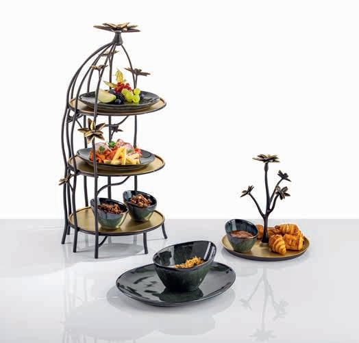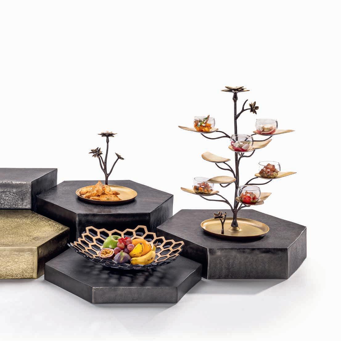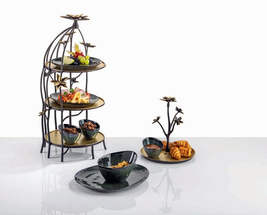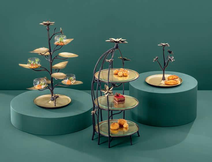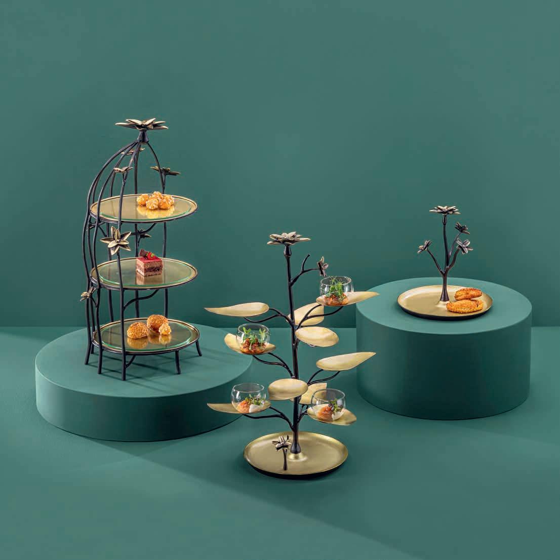 „Fleur Déco“ ist komplett aus Messing gefertigt und umfasst eine dreistufige Etagere für Teller und Platten, eine Servierplatte und einen Buffetbaum in floraler Gestaltung.