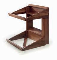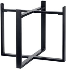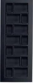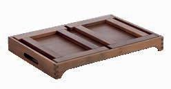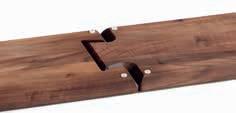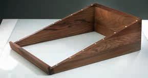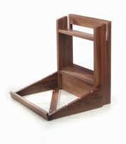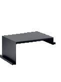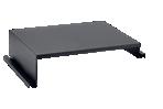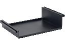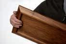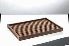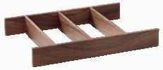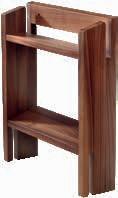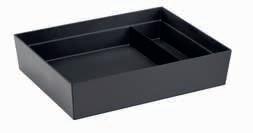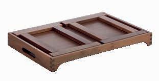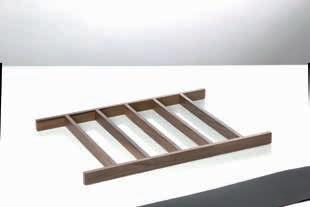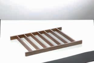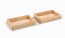 Der schmalere Zwischenboden aus Stahlblech kann auf allen Querstreben der Seitenteile eingelegt werden. Auf der untersten Ebene besteht sogar die Möglichkeit, zwei dieser Tabletts direkt hintereinander zu platzieren (vgl. Setup 2). Die Breite dieser Tabletts ist exakt auf die kleinere Box abgestimmt. Zusätzlich lassen sie sich mit Einlagen aus Eschenholz bestücken, die sowohl eine glatte Seite als formschöne Ablage als auch eine mit gefrästen Rillen versehene Seite bieten, welche sich ideal als Schneidbrett für Brot oder ähnliches eignet.