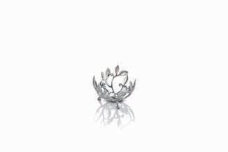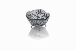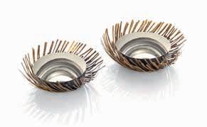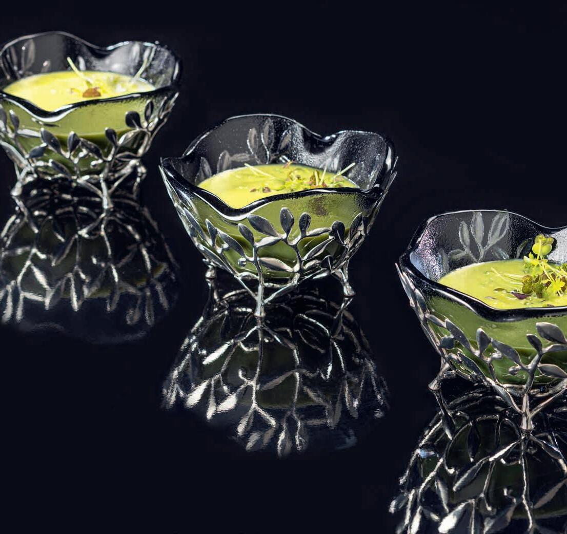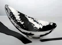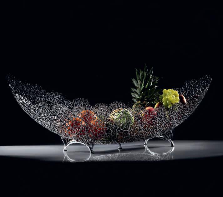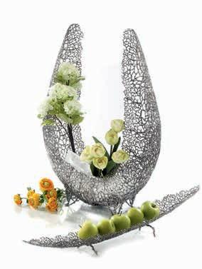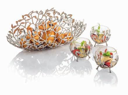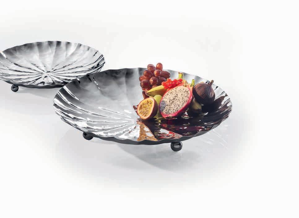 Mit „Flora“ erweitern zwei kunstvoll gefertigte Buffetschalen aus massivem Edelstahl unser Sortiment. Von Hand in gehämmerter Optik gearbeitet und mit einem zarten floralen Dekor versehen, verbinden sie zeitlose Eleganz mit meisterhafter Handwerkskunst. Auf vier Kugelfüßen ruhend, werden sie zu einem stilvollen Hingucker auf jedem Buffet.