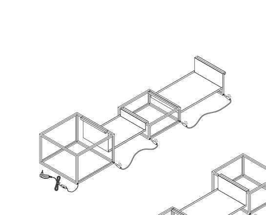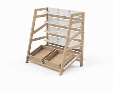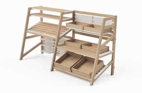 Die Basis des Systems bilden die Seitenteile, deren schräg und gerade angeordneten Querstreben eine einfache und flexible Platzierung von Verbindungselementen ermöglicht. Diese Zwischenelemente – ein Tablett aus beschichtetem Metall sowie ein Leistenboard aus Eschenholz – verbinden die Seiten und können als Regalböden oder als multifunktionale Rückwände verwendet werden. Beim Einsatz als Rückwand werden sie sicher durch integrierte Magnete gehalten und verleihen dem Aufbau die nötige Stabilität.
