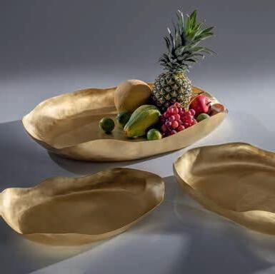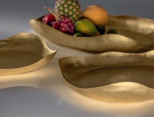 Die Schalen „Orea“ faszinieren durch ihre organische Gestaltung und den warmen, mattgoldenen Farbton des massiven Messings. Die natürliche Patina, die im Laufe der Zeit entsteht, verleiht jedem Stück einen einzigartigen Charakter und macht jede Schale zu einem besonderen Unikat.
