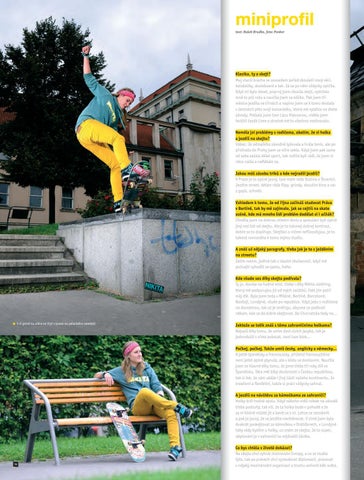 Klasika, ty a skejt? Muj starší brácha se sousedem pořád zkoušeli nový věci, koloběžky, skateboard a tak. Já se po něm vždycky opičila. Když mi bylo deset, poprvý jsem zkusila skejt, vydrželo mně to půl roku a naučila jsem se olíčko. Pak jsem tři měsíce jezdila ve třinácti a naplno jsem se k tomu dostala v šestnácti přes svoji kamarádku, která mě vytáhla na skate závody. Potkala jsem tam Lůcu Hlavsovou, viděla jsem holčičí časák Lime a strašně mě to všechno motivovalo. Neměla jsi problémy s rodičema, okolím, že si holka a jezdíš na skejtu? Vůbec. Já odmalička závodně lyžovala a hrála tenis, ale po příchodu do Prahy jsem se všim sekla. Když jsem pak sama od sebe začala dělat sport, tak rodiče byli rádi, že jsem si něco našla a neflákám se. Jakou máš zásobu triků a kde nejradši jezdíš? V Praze je to úplně jasný, tam mám ráda Stalina a Štvanici. Jezdim street, dělám ráda flipy, grindy, zkoušim kino a var z gapů, schodů. Vzhledem k tomu, že od října začínáš studovat Práva v Berlíně, tak by mě zajímalo, jak se cejtíš na skate scéně, kde má mnoho lidí problém dodělat si i učňák? Chodila jsem na dobrou střední školu a spolužáci byli úplně jiný než lidi od skejtu. Ale je to takovej dobrej kontrast, dobře se to doplňuje. Skejťáci o ničem nefilozofujou, je to taková rovnováha k tomu mýmu studiu. A znáš už nějaký paragrafy, třeba jak je to s ježděnim na streetu? Zatim nevim, jedině tak z vlastní zkušenosti, když mě policajti vyhodili ze spotu, hehe. Kde všude ses díky skejtu podívala? Ty jo, docela na hodně míst, třeba i díky Nikita clothing, který mě podporujou již od mých začátků. Fakt jim patří můj dík. Byla jsem teda v Miláně, Berlíně, Barceloně, Basileji, Londýně, všude po republice. Když jedu s rodičema na dovolenou, tak už je směřuju, abysme se podívali někam, kde se dá dobře skejtovat. Do Chorvatska tedy ne... 5-0 grind na zídce ze čtyř v praze na palackého náměstí