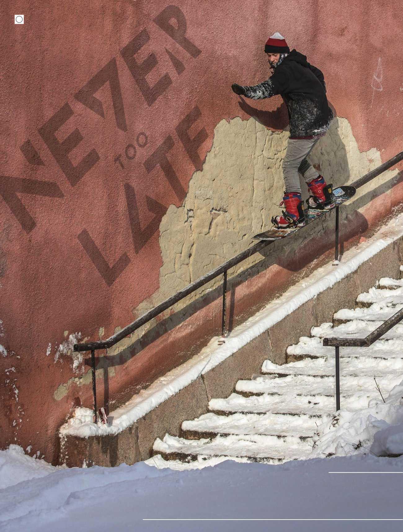 na horší techniku, takže výsledek nevypadá zas tak dobře. Já i Filip jsme názoru, že snowboarding je krásná vizuální věc a byla by škoda ho nezachytit co nejkvalitněji, nevyužít slowmotionů, technicky čistejch záběrů a podobně. Všechno točíme na vybavení Sony – na kameru FS5 a pak většinou na stabilizačním systému DJI Ronin upevněnej foťák Sony A7s. K tomu dron DJI Phantom, ale na některý shootingy budeme brát velkej vrtulník, který umí nést právě foťák A7s. Většinu bude natáčet právě Filip a s návaly sněhu teď pomáhal v Liberci Martin Kolařík, fotí nám střídavě Honza Kasl, Yan Renelt a Michal Prouza. Další bod k zamyšlení bylo, jak to vlastně celý pojmeme z pohledu „scénáře“, protože možností je víc. V poslední době frčí částečně cestopisný filmy a různý webizody, prostě jako že parta jede na nějakou lokaci a z toho je jeden díl, pak jede někam jinam a z toho je další atd. V podobným ražení byly i všechny český Snowporningy, vlastně poslední větší video projekty, který tu v Čechách vznikly. My jsme si s Fílou i riderama řekli, že je na čase se vrátit k tomu, co jelo dřív, když jsme byly mladý, a co jsme hltali od produkcí jako Absinthe, Standard, Isenseven, Pirates nebo Forum. Prostě filmy rozdělený na party jednotlivých jezdců. Takovýhle uspořádání filmu motivuje ridery, každý si chce za tu sezónu natočit to nejlepší, ty největší bomby, který dokáže. Takže rámcovej scénář jasnej, akorát teď zvolit dobrý lokace a naplánovat sezónu. Po předešlých zkušenostech, a i vzhledem k tomu, že já i Filip máme svojí práci, nedokážeme být celou zimu stand-by a čekat, až třeba ve Špindlu napadne, a pak se tam vydat, tak to naše filmování musíme dělat tak trochu obráceně. Naplánovalo se několik časových oken během sezóny, kdy se bude natáčet, a jak my, tak fotografové a rideři, s tím mohou počítat. Podle sněhu se pár dnů před odjezdem rozhodne, kam se vůbec pojede, a podle místa se pak určí, kteří jezdci se toho zúčastní, protože nemá cenu tahat streetový šreďáky do backcountry a naopak skokany na street, to je jasný. Tenhle plán se nám ale „lehce“ změnil, protože jako na potvoru napadlo i u nás strašně moc sněhu. Samozřejmě je to super, jsme nadšený, že zrovna v sezóně, kdy točíme video projekt, tak nasněží magory. Nicméně nám to překopalo celej plán a od začátku roku s Fílou skoro nevíme kam dřív skočit. Je to skvělý, zároveň ale dost únavný, protože aby člověk mohl natáčet, odkládá svojí normální práci. Na druhou stranu to nechceme propásnout, protože může přijít obleva a my chceme domácí lokace využít na maximum, už jenom proto, že třeba týden natáčení v Krkonoších stojí desetkrát míň než v Alpách. Začali jsme tedy točit u nás a u sousedů na Slovensku, převážně to jsou streety, prostě využíváme ty hromady sněhu, co napadly. Na Slovensku to bylo dost zajímavý, celou dobu jsme měli mínus 25 stupňů a v tom se dost blbě pracuje, protože začíná zlobit technika a lidi samozřejmě taky nemůžou fungovat jako za normálních teplot. Při natáčení se hodně snažíme využít winch, naviják, který nám na zakázku vyrobil Honza Zajíc. Ve světě se tohle používá dost, u nás zatim ne v tak výrazný míře. Díky navijáku se můžeme rozjíždět i po rovině do dostatečný rychlosti, což otvírá úplně nový možnosti. Kromě Slovenska se zatím točilo v Liberci a okolí, kde je to pravej šreďákův ráj. Spotů tam je strašně moc a kluci pořád nacházejí další a další. Klasickou základnou je i Špindl, ve kterym máme dobrý zázemí, a v okolí je spousta ještě nezprzněných spotů.