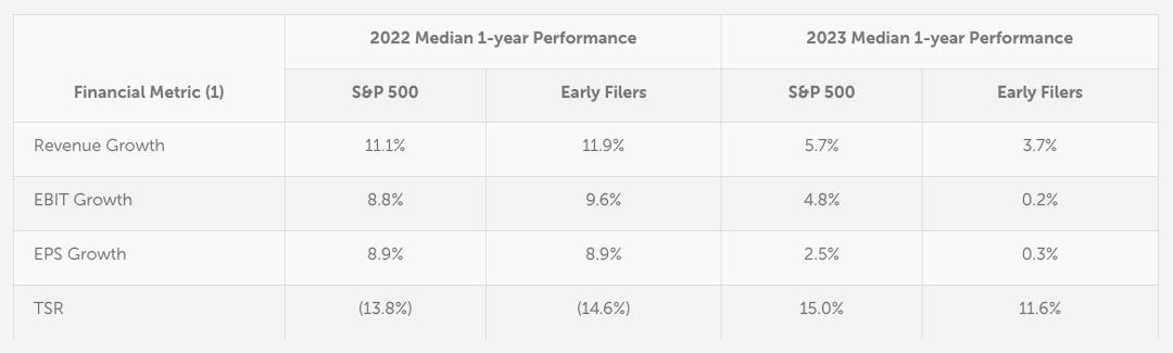 performance. Median TSR was up +11.6% year over year. The stock market has been volatile post-pandemic and further impacted by macroeconomic issues such as inflation, higher interest rates, supply chain difficulties, and geopolitical instability. One-year financial and TSR performance for the Early Filers slightly underperformed the S&P 500, which experienced modest growth in 2023.