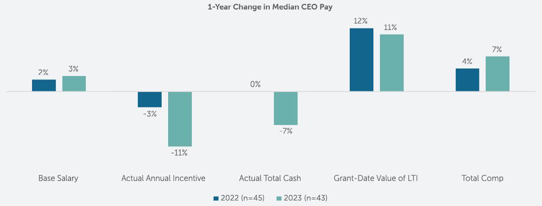 2023 financial performance was generally flat compared to 2022. We continued to see an increase in total direct compensation for CEOs, although bonus payouts were down moderately year over year. These increases in total direct compensation were largely