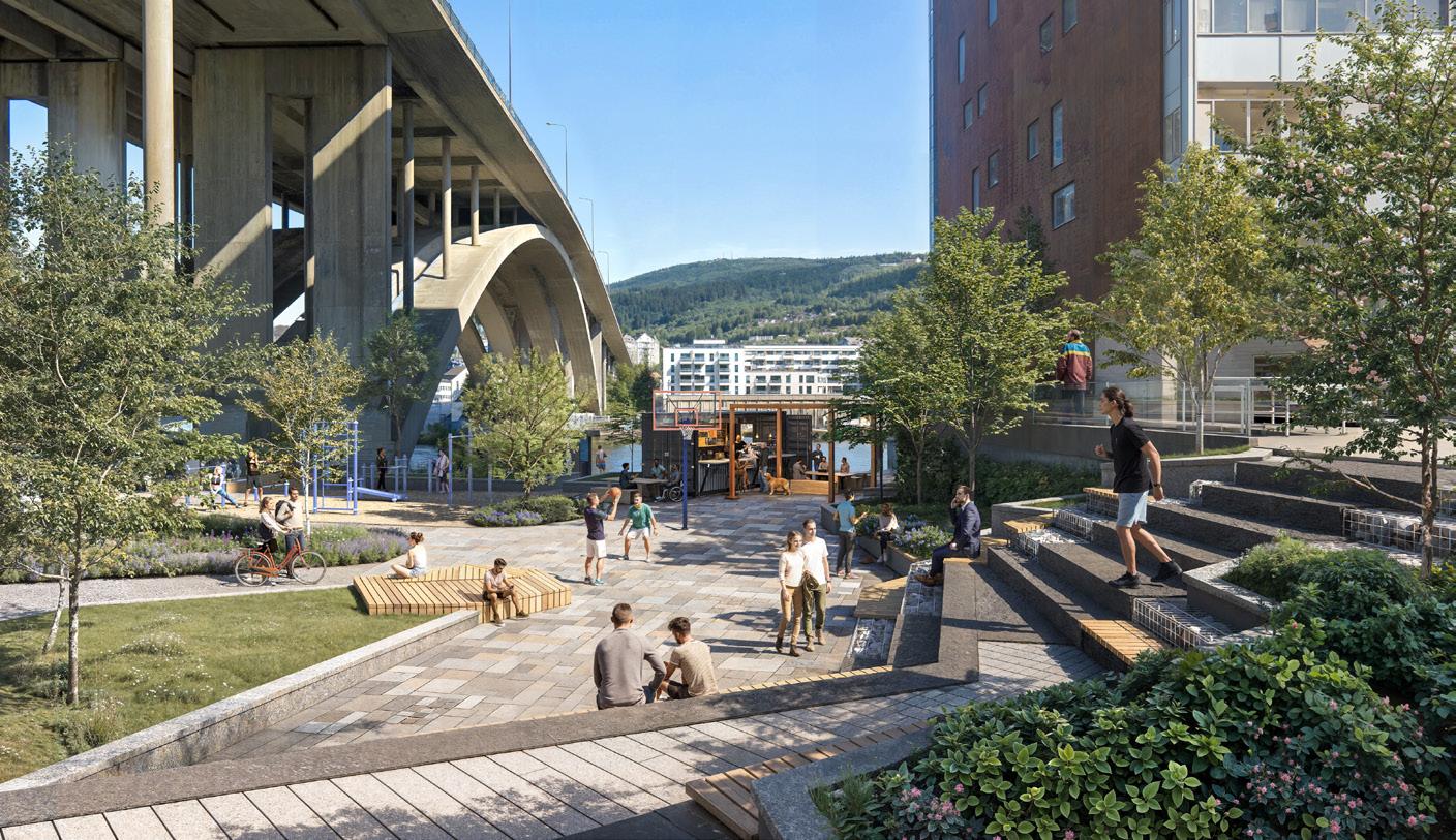 Planen er å bygge en grønn lunge med ulike soner for både aktivitet og sosialisering. Her kommer det treningsapparat, basketballkurv og amfi. På området ønsker også BOB å sette opp et enkelt bygg som kan huse pop-up kafeer eller lignende aktiviteter.