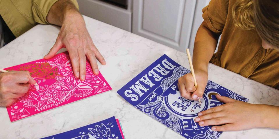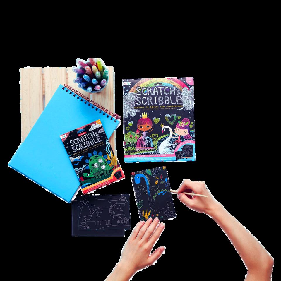 This Scratch Art kit invites young artists and the young-at-heart to discover vibrant artworks hidden beneath the surface