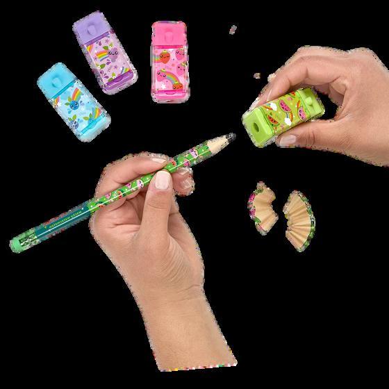 Displayof16individualmini-coloured pencilsof12colourswithsharpener 8ofRainbows&Unicornsdesignand8of OuterSpacedesign