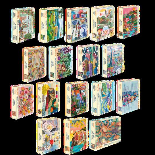 Fromcompact48and100-piecepuzzlesperfectforquick,mindful breakstointricate1,000-piecechallenges,eachpuzzleshowcases original,hand-selectedartwork,ensuringacollectionthatisasdiverse andexpressiveastheartistsbehindthem