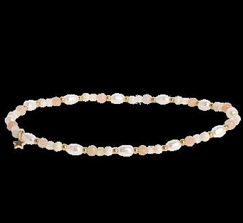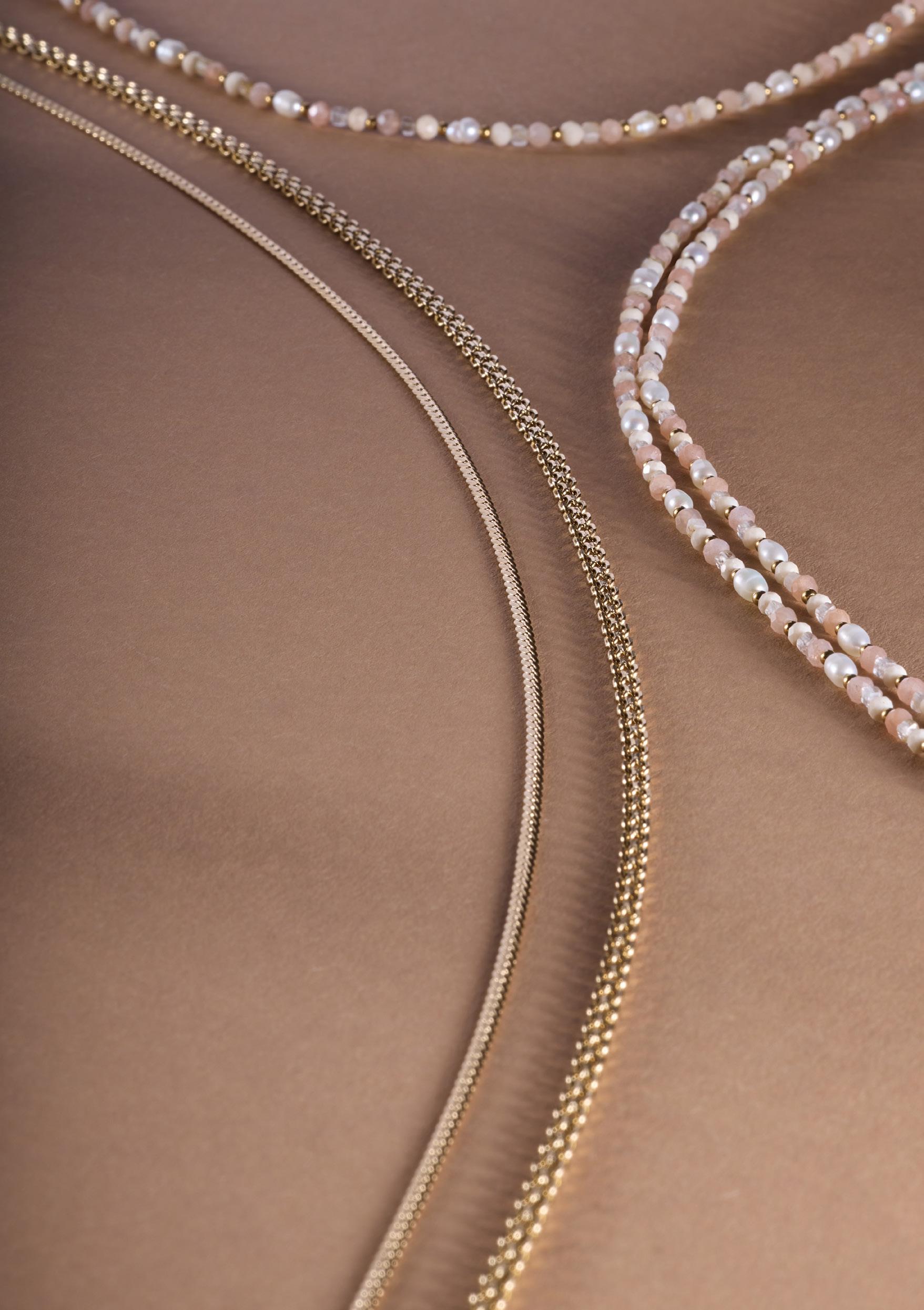 Mit fein abgestimmten Süßwasserperlen in Beige- und Rosétönen, kombiniert mit goldenen Details, entsteht ein harmonisches Zusammenspiel aus Wärme, Klarheit und zeitloser Eleganz.