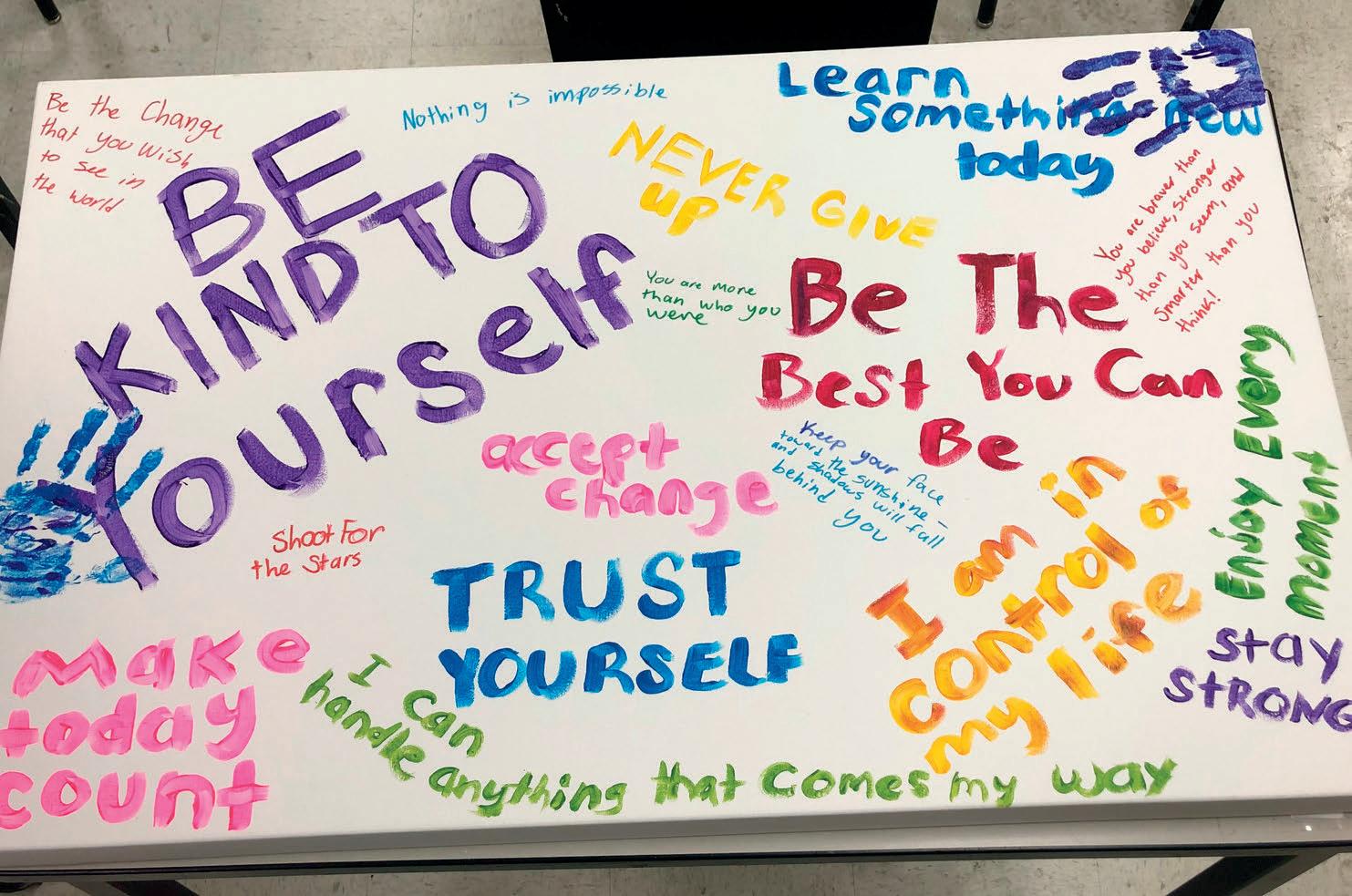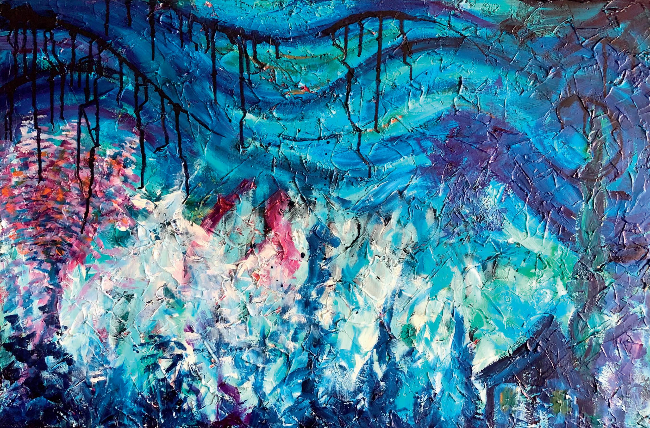 I created this painting during my senior year of high school with the intention of displaying it in my future college apartment. Anticipating the initial stress and mental turmoil of the transition to college life, I decided to include several uplifting comments underneath my painting so that every time I look upon it, I can feel the same sense of calmness I felt when writing the messages. The surface painting is an expression of my perception of serene energy - inspired by several of my favorite impressionist painters, stories from my favorite novels, and a tranquil color palette.