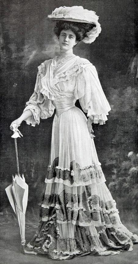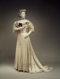 The beginning of the 1900s reflected the end of the 1800s. Women’s daywear continued to be formal and dressy whilst retaining the modesty that was overwhelmingly visible at the beginning of the century. Evening dresses reflected a looser nature, a lower cut bodice and the occasional off the shoulder sleeve. The dresses themselves were heavily structured with the help of a corset and were made with light colored, satin and chiffon fabric. There was no shortage of the lace and bead embellishments on hems and sleeves. Eastern fabrics were heavily coveted by the wealthy, while the lower class wore cheaper alternatives.