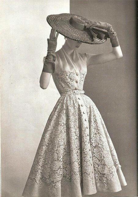 N/a. This is a typical 1950s dress.1950s style included feminine and romantic silhouettes - full circle skirts, fitted pencil skirts and A-line shapes - that marked women's return to home and hearth after the war years.Dior and Balenciaga are the most successful designers in this decade And all of the beautiful changes from Dior "New look" 1947 ... more.