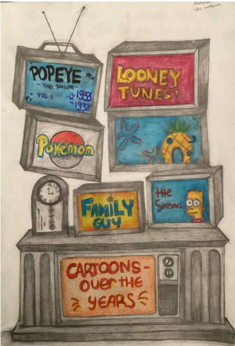 This artwork depicts the evolution of popular cartoon series throughout the years, ranging from old-fashioned shows such as PopEye the Sailor to more modern series such as Family Guy.