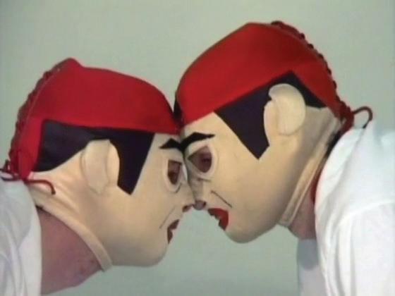 Amorales Interim (1997) by Carlos Amorales plays on a floor console cathode-ray tube television inside a wooden cabinet, and broadcasts two men in masks, slow-motion wrestling one another out of a ring. Amorales is interested in the Mexican culture of free wrestling, where wrestlers hide