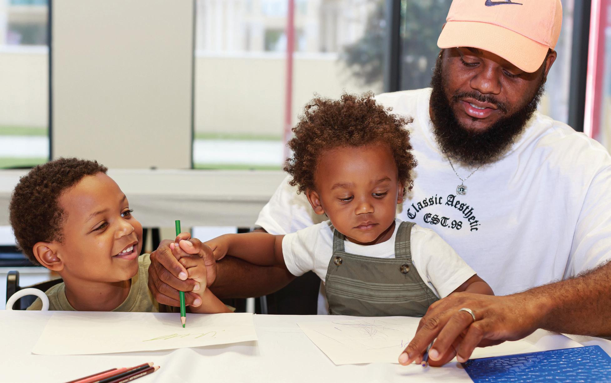 He focused his camera on a shadowy corner in the hallway and snapped a photo. When he later pulled up the image on his computer, he discovered what had been calling to him: a grandfather, father, and son collaborating on a drawing, their heads lowered in shared concentration. It was their closeness that most captivated him—three generations of men sharing a quiet, intimate moment, despite the whirl of distractions around them.