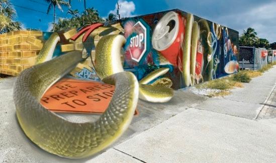 Once completed, the mural, will cover most of the one-story building and part of the parking lot. The design represents urban and natural life in Florida and includes coke cans, stop signs, shipping containers, gold, wedding rings, flamingos, snakes and more.