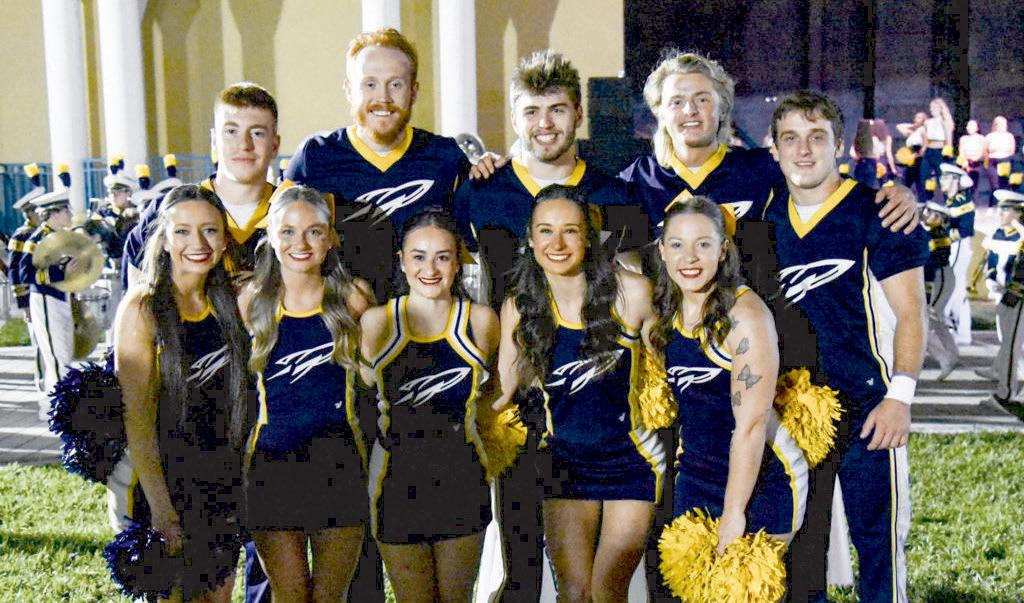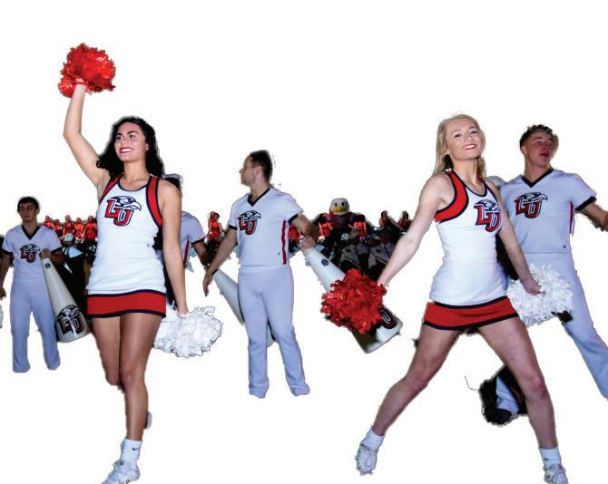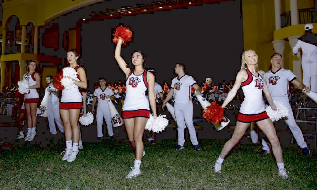 Liberty University cheerleaders perform at pep rally at Mizner Park Monday night.
