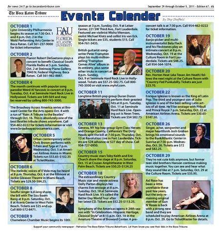 season at 3 p.m. Sunday, Oct. 9 at Leiser Center, 221 SW Third Ave., Fort Lauderdale. Featured are violinist Misha Vitenson, violist Michael Klotz and cellist Iris van Eck. Single tickets are $35, students $15. Call 954-761-3435. British guitarist-songwriter Peter Frampton plays his multi-millionselling “Frampton Comes Alive” album in its entirety, plus some other tricks in concert at 8 p.m. Sunday, Oct. 9 at Seminole Hard Rock Live in Hollywood. Tickets are $57.25-$82.75. Call 800745-3000 or visit www.myhrl.com.