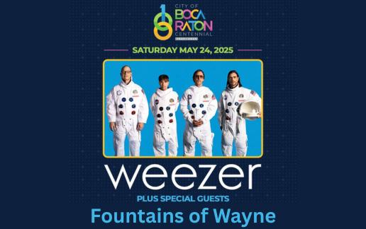 Boca Raton, FL – Stacy’s mom has got it going on… and she just might be in the crowd! In celebration of the City of Boca Raton’s 100th birthday, Fountains of Wayne is officially joining the party as the opening act for Weezer at the Centennial Celebration Concert on Saturday, May 24, at the Mizner Park Amphitheater.