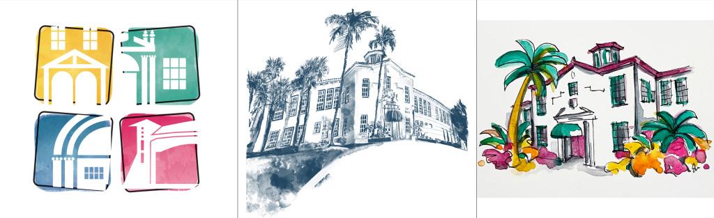 More than 30 local artists submitted original watercolor illustrations that visually interpret the spirit and story of Old School Square. A panel of local arts and design professionals reviewed the entries and selected three finalists whose work reflects Delray’s creative energy, cultural legacy, and tropical charm: