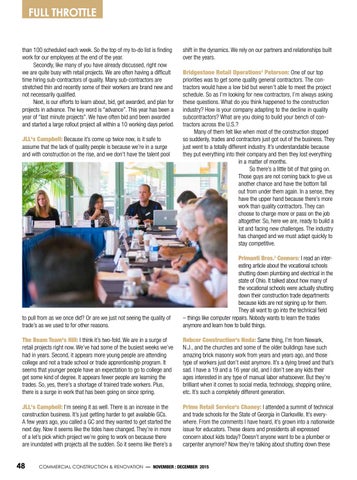 shift in the dynamics. We rely on our partners and relationships built over the years. Bridgestone Retail Operations' Peterson: One of our top priorities was to get some quality general contractors. The contractors would have a low bid but weren’t able to meet the project schedule. So as I’m looking for new contractors, I’m always asking these questions. What do you think happened to the construction industry? How is your company adapting to the decline in quality subcontractors? What are you doing to build your bench of contractors across the U.S.? Many of them felt like when most of the construction stopped so suddenly, trades and contractors just got out of the business. They just went to a totally different industry. It’s understandable because they put everything into their company and then they lost everything in a matter of months. So there’s a little bit of that going on. Those guys are not coming back to give us another chance and have the bottom fall out from under them again. In a sense, they have the upper hand because there’s more work than quality contractors. They can choose to charge more or pass on the job altogether. So, here we are, ready to build a lot and facing new challenges. The industry has changed and we must adapt quickly to stay competitive.