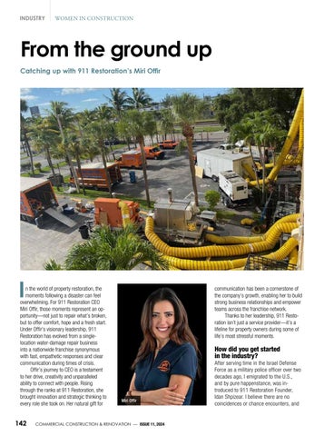 In the world of property restoration, the moments following a disaster can feel overwhelming. For 911 Restoration CEO Miri Offir, those moments represent an op portunity—not just to repair what’s broken, but to offer comfort, hope and a fresh start. Under Offir’s visionary leadership, 911 Restoration has evolved from a singlelocation water-damage repair business into a nationwide franchise synonymous with fast, empathetic responses and clear communication during times of crisis.