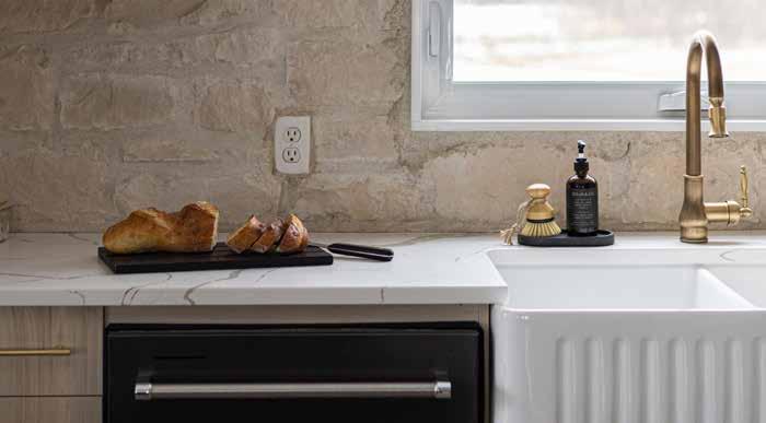 spaces invite feelings of relaxation and openness, encouraging social gathering and connection. Using complementary materials, colors and design motifs can cut through the chaos of busy households to create a calming environment that’s grounded in consistent design details. For example, to make spaces seem larger and more interconnected, use the same stone profile on an indoor fireplace and outdoor patio wall, or carry a kitchen backsplash out to a covered grilling area.