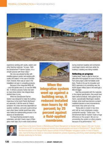 experience working with caulks, sealers and other flashing materials,” he says. “With the DensElement™ Barrier System, it’s a simpler process with fewer steps.” His crew was already familiar with installing gypsum panels, and working with caulks and sealers. In the case of DensElement, however, there was an ease in the installation not seen in competing products. Because of the integrated WRB-AB – once the panels were in, so was the WRBAB. It refined a process Tooley had seen so many times before: two integral steps distilled down to one. While the DensElement Barrier System was designed to make the building impervious to the harsh Pacific Northwestern elements, it did the same for Tooley’s schedule. His crews were less dependent on weather conditions, and work could continue even when heavy rainfall would have otherwise halted the waterproofing process in the absence of DensElement. The liquid flashing bonded to damp substrates, and didn’t need a layer of fiberglass mesh tape. Dry-in work could continue