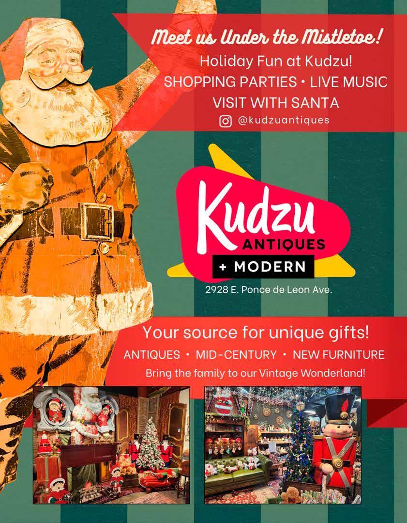 Kudzu Antiques + Modern is a Decatur treasure with a legacy more than four decades strong. Consistently voted Atlanta’s Best, the family-owned shop fills its 26,000-squarefoot space with a dynamic mix of antiques, vintage finds and modern furnishings sourced from around the world. Warm service, inspired curation and a true sense of discovery make every visit feel like an adventure. From collectors to casual browsers, Kudzu brings history, design and community together under one welcoming roof. kudzuantiques.com