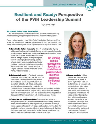 Resilient and Ready: Perspective of the PWH Leadership Summit By Kaycee Kalpin We attended. We took notes. We networked. But, now after the PWH Leadership Summit, what takeaways can we honestly say have fundamentally changed our perspectives on our profession and our purpose? For me – without question – it was Valorie Burton’s Resilient and Ready keynote. It’s no wonder that she’s written 11 books and is an acclaimed life coach; she just gets it. I am finding myself referencing several of her key messages in my day-to-day. Here are a few: 1) Be resilient in the face of adversity – I’m a 30-something mother of young children and a healthcare marketing leader. Some of you might relate with the prejudice experienced toward working moms: too young; too inexperienced to be a boss; spread too thin; should be home with kids. Newsflash: I’m over it and I’m owning it. Balancing the many moving parts of my life is challenging, but so rewarding. According to Valorie, resilient people have a level of psychological capital and mental toughness that enable us to perform and lead better under stress. Instead of apologizing for it, I’m going to embrace this stage of life moving forward. After all, I’m better because of it.